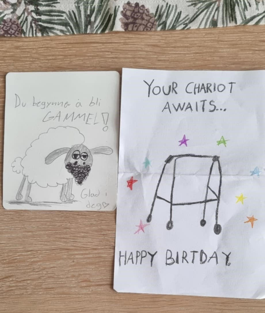 Av barn og fulle folk får en høre sannheten er et norsk ordspråk. Barn og fulle folk tenker ikke på hva personene de snakker med vil høre men sier rett ut det de mener. Her sa de det ikke bare rett ut, men jeg fikk det overlevert i grafisk form. 2 tegninger laget med omtanke. Håper jeg. Men de har jo rett.
