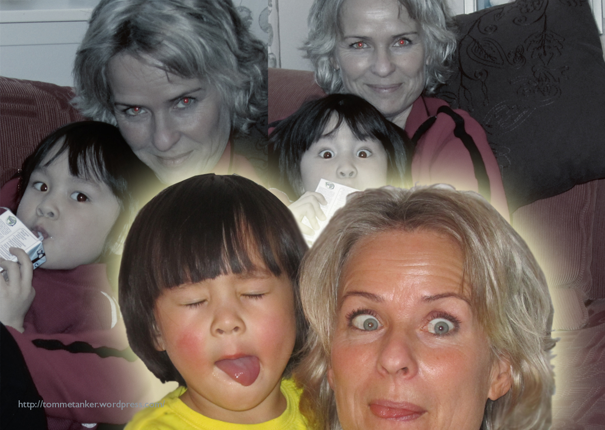 på henne. Jeg betalte, puttet kjekt et par bær opp i nesa, snublet i bordet på vei vekk, sa et buktaler “takk” og ble rødere enn bæran i nesa. Første og siste møte. – skulle en følge min statistikk. Men av en eller annen mystisk kjempeflakshendelse traff jeg ho igjen. Og av en eller annen mystisk kjempeflakshendelse valgte hun meg. Jeg er som kjent kjekkest langt vekk. Men jeg var ikke tung å be. Jeg så at dette var et vindu i evigheten som jeg bare måtte hoppe inn i. Og med denne skjønnheten har jeg levd, -lenge. Noen ganger er hun mild som philadelphia smøreost, andre ganger mild som chilli. Det bor litt Lofotstorm i hjertet hennes. Og så kom barnebarnet. Sønnen vår gjorde som meg. Av en eller annen kjempeflakshendelse fikk han ei vakker kone. Også hun mild som chilli. Når mine skjønnheter er sammen er de både skjønnheter og udyr. Skulle ønske jeg visste tid og sted for de ulike stemningene. Etter sammenligning og koordinering av hendelsesbaserte erfaringer har vel ca. 100% av mine mannlige venner samme erkjennelse. Koner og barn og barnebarn er skjønnheter og udyr.