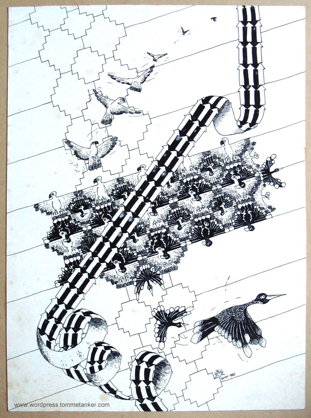 Og noen tegnere ser ting som er vanskelig for oss andre å skjønne. I mitt liv som blyantholder er det en som står over alle andre. Salvador Dali er stor, men det er en som er større for meg, – Maurits Cornelis Escher (1898-1972). Hans “kunst” er hinsides all fornuft. Han var en mester i svart og hvitt. Med utrolig presisjon tegner han umulig bygninger og lekne overganger. Ting glir over i hverandre og du blir usikker på hvor ting begynner eller starter. Han ble født i Leeuwarden i Nederland, men bodde i Arnhem mye av sitt liv. Inspirasjon fikk han av mange år i Italia og Spania, hvor hans ek med arkitektur, perspektiv og umulige rom gav ham mange tilhenger. Jeg oppdaget ham når jeg var 12 år, på en speidertur til Amsterdam. Oh lykke. Vet ikke hvor mange timer jeg har stirret på hans umuligheter. Alle kjenner ham og har sett noen av hans verk, men ingen vet hva han heter. Akkurat som meg. Men han inspiererte og en stund forsøkte jeg meg på hans stil. Men. Skulle innse at en trenger ensmule matematikk i hodet også for å tegne slikt. Men GUDD å stilig. Thank you mr. Escher.