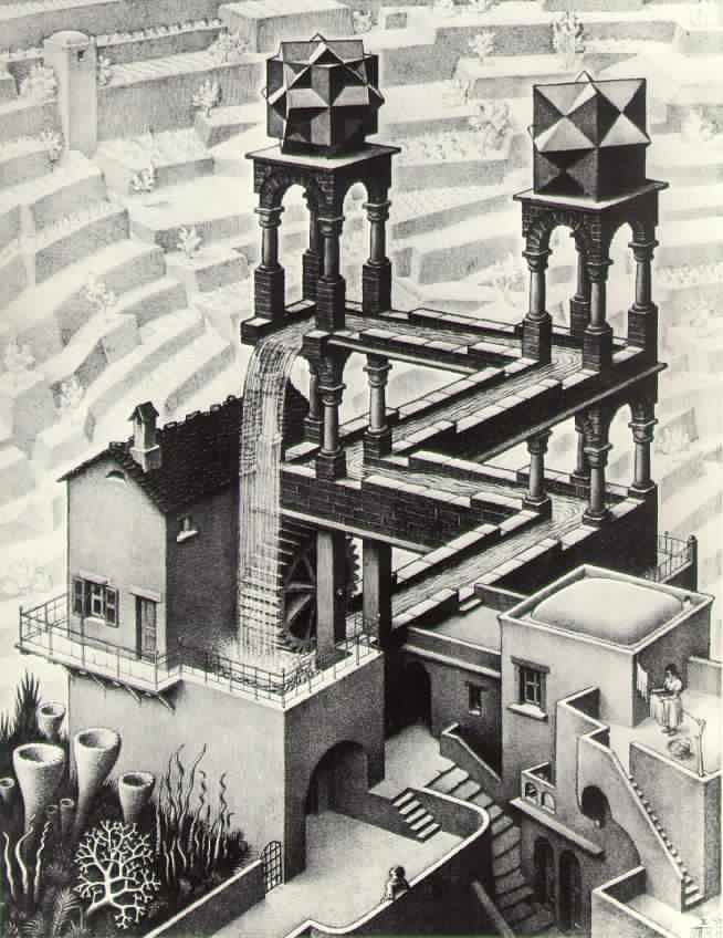 Min helt M.C.Esher. Jeg er groupie! I en alder tilhørende de øvre deler av 8 gangen kan en neppe kalles groupie, men jeg digger mesteren med de svarte og hvite illusjonsillustrasjonene. Han leker med hodet til iaktakeren og etter ett kjapt blikk på hans kunst legger alle hodet på skakke og sier hmmmmmmmmm. Med sikker hånd leder han oss inn i sine mystiske lekenheter med perspektiv og konstruksjon. På hans opphold i Italia og bl.a. i Cambria i Spania lagde han mange skisser av lokal arkitektur. Mye av dette dannet grunnlaget for hans fantastiske hjernevrengende trykk og tegninger. En av de mest kjente er Waterfall,- et litografi fra 1961. Det måler beskjedne 30 x38 cm , og har en evne til å vekke nysgjerrigheten i oss. En hver ingeniørspire må stoppe opp og se. Ved første øyekast er det jo bare et vakkert gammelt murbygg, med et vannverk. Men se i mer en 2 sekunder så ser du at vannet renner oppover hele tiden. Det baserer seg egentlig på en tegning av Eschers venn,- den britiske matematiker og fysiker Roger Penrose. Det fasinerer, og mange har forsøkt å etterligne Eschers ide. Gjenskape hans skavanker.