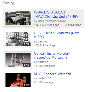 Men altså. I min søken etter Waterfall av Escher dukket listen til høyre opp. Og hva er på toppen. Det begynner å krible. Det begynner å klø. Det begynner å banke. Erogen zonestyring er helt ute av kontroll og vrinsker av lykke. Muntre bjeff og knopper som vårlig springer ut. På toppen, uvisst av hvilken grunn, kommer “WORLDS BIGGEST TRACTOR”. Oh, lykke. Legg merke til hvem som har publisert. En bit av noe høyverdig klassisk,- GrosTracteursPassion. Så menn i alle land,- Det er noe kvinnene aldri kan ta fra oss. Klikk og nyt: http://www.youtube.com/watch?v=_UTbYnKEjcY&feature=fvwrel