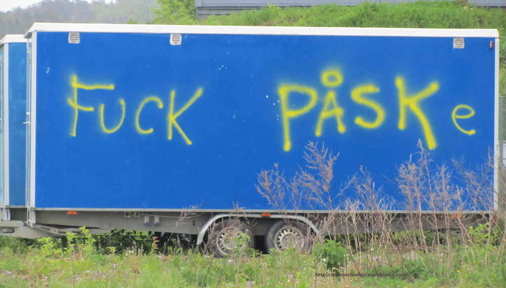 På vei til jobb en dag så jeg en ny tagging. Stor tagging. Litt skummel tagging. Enkelt budskap, men sannsynligvis ikke så enkel forklaring. Hvem er det som skriver slikt? Hvem er det som er vennene til den som har skrevet dette? Hvem ga denne personen en god klem sist?. Jeg har jo ikke peiling, men det aner meg at det ligger mye grums i historien bak denne tagginga. Kanskje noen fler klemmer forut for tagginga hadde fjernet litt grums.