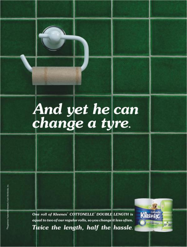 Stilig annonse fra byrået JWT, Australia. Flott utført av kreatørene Andy Di Lallo 0g Jay Benjamin, Skulle tro det var ei dame som hadde lagd den. Men vi menn vi kjenner vel lusa på gangen vi og. Litt selvinnsikt synker inn hos oss og. Hvorfor er det egentlig slik at vi menn ikke gidder. Jeg tror vi skjønner hvordan og hvorfor en ting bør gjøres. I dette tilfellet bør vel strengt tatt dorullen skiftes. Men hvorfor gjør vi det ikke. Og det at noen kan lage denne annonsen og at de fleste skjønner den betyr jo at vi ikke gidder å skifte den forbanna dorullen. Blir litt flau over oss menn noen ganger. Men så er jo jeg en dame innestengt i en mannskropp i følge flertallet av mine kollegaer.