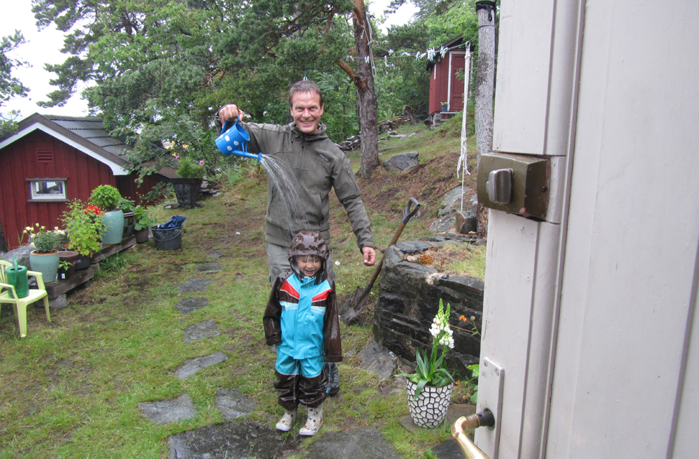 De må jo vannes disse frøene. De unge spirene som skal blomstre og bli til noe. Og her en dag når det pøste ned fikk jeg hjelp av Lucas. Den lille, gode, iherdige hjelperen. Vi grov og vi spadde og satt ned alt mulig av planter og frø. Mye var kommet etter et raid i mine foreldres vakre blomster bed på Gimlekollen. “Vanne meg og,” pep det fra nedenfor. “Hva?”, sa jeg. “Vanne meg og, bestefar!” pep det nok en gang. “Okei”, sa jeg. Og som sagt så gjort. Jeg vannet poden.