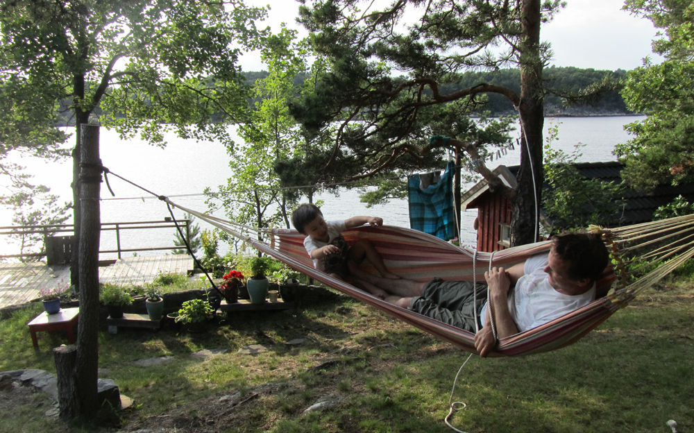 På en reise i Mexico en gang kjøpte vi en hammock, – hengekøye. Den var tiltenkt late dager med øl og vin og kveldssol og 24 grader i skyggen. Den er brukt til det også, men den får virkelig kjørt seg når Lucas kommer.