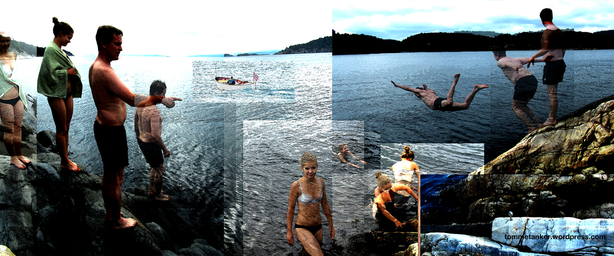 Hva skulle en gjort uten familie. Kanskje en hadde hatt litt selvrespekt og innsikt dersom familien ikke holdt deg nede. “Pyse”, – roper niese Oda. “Feiging”,- fortsetter hun. “Førstemann uti”,- utfordrer hun meg i det hun løper forbi. “E du kylling?”Jeg hadde vel strengt tatt ikke et bad på kalenderen akkurat nå, og kylling får jeg vel ta som et komplement. Jeg med min aquadynamiske kropp. Vel. Bade? I sjøen. I sikkert 2 grader + vann. Men for ikke å bli dradd ennå lenger ned på rangstigen tok jeg utfrodringen. Vi bada. Oda og jeg, mens resten lo og kommenterte