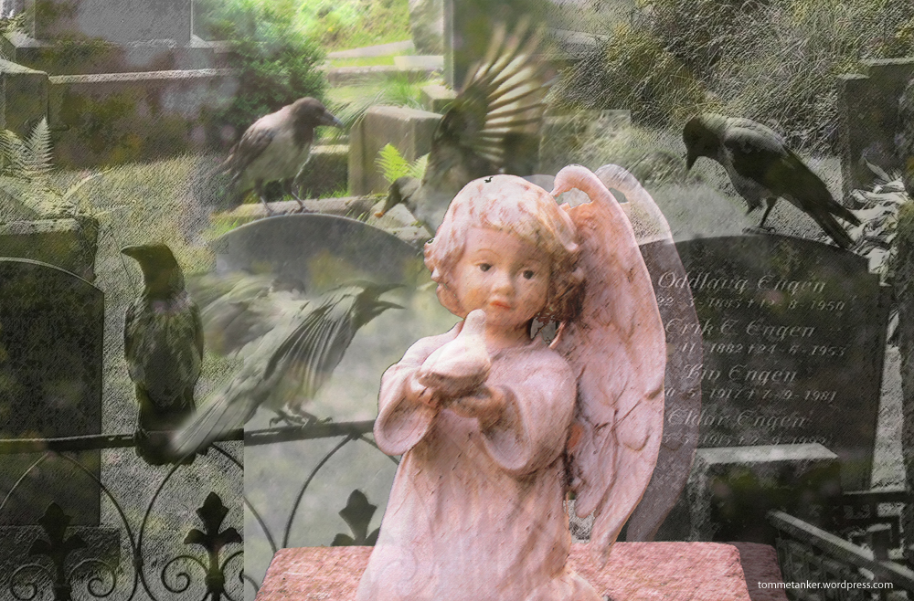 Engler og demoner. De ble kastet på meg. Ikke englene. Men demonene. Jeg stod og studerte en vakker liten engel på toppen av en gravsten i vår Frelsers Gravlund i Oslo. Uendelig vakker og sart. Bitte liten og lys. Hugget i marmor. Varsomt plassert på toppen av et dødsmonument for en disponent av forrige århundre. Mistet en vinge hadde engelen, men stod der likefullt og rakk frem en due. Vakkert. Fredfult og vakkert, så stille og vakkert at jeg forsvant inn i engelens verden et øyeblikk der jeg stod henfallen og nøt øyeblikket. Her stod jeg ved siden av Bjørnstjerne Bjørnsson, Werenskjold, Munch og min første TV -helt, Romeo Klive alias Alf Prøysen. Her ligger Henrik Ibsen og hviler. Det var da Dan Browns,- Engler og demoner