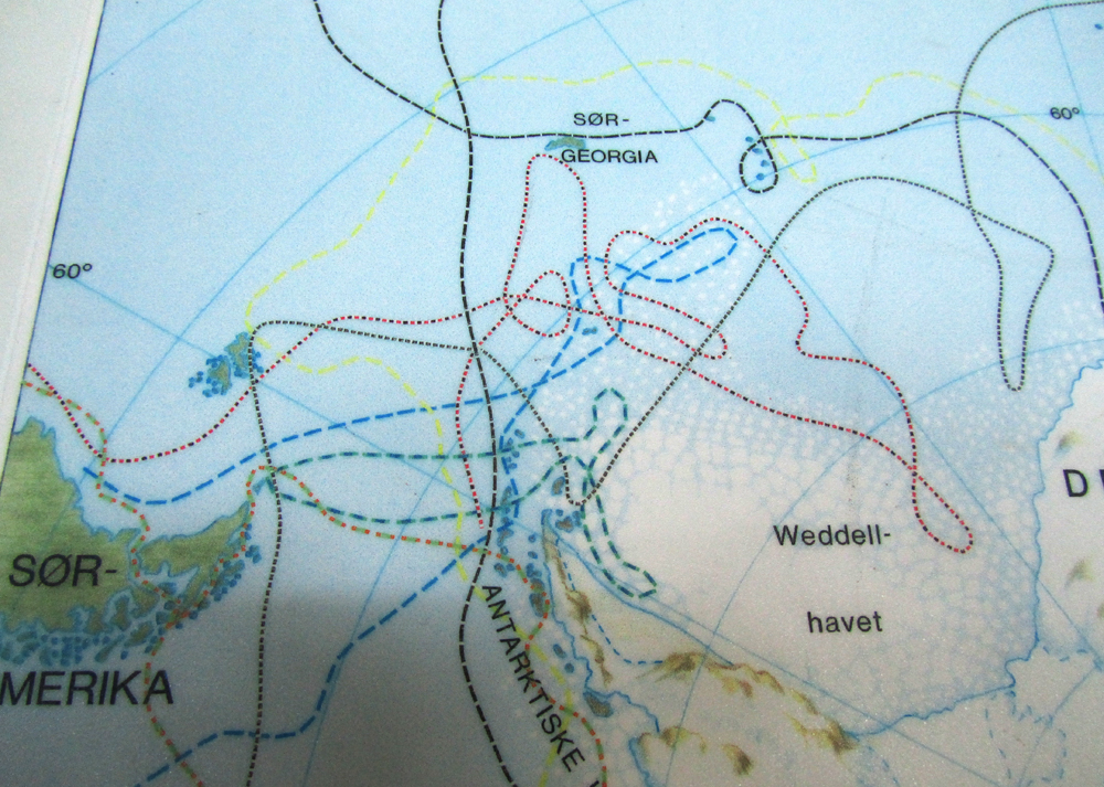 På dekket av skipet, like ved roret står det en liten plansje med inntegninger av hvor de ulike ekspedisjonene seilte. Og studerer man det vil man undres over retningssansen til disse våre polarhelter. Eller var kompasset i villrede så langt vekk fra den magnetiske polen? Eller var det dødgang på roret? Jeg undres.
