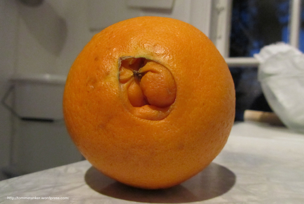 Det er jo ikke slik vi ønsker det. Slett ikke slik en mor ønsker at barnet skal komme til verden. Men av og til er det tryggest. Av hensyn til både mor og barn. Keisersnitt. Ikke tsar-, knekt-, dronning- eller kongesnitt. Men nå kom nå en gang denne appelsinmammaen på bordet. Fruktbar og fin. Og skikkelig skal det være, -Keisersnitt. Rent saftig så hun ut. Deilig, fine runde former. Litt vel mye appelsinhud over det hele, men vakker og strålende likevel. Med tanke på at herligheten, både mor og barn, skal fortæres og fordøyes etterhvert er det kanskje rart at en gjør seg slike refleksjoner.