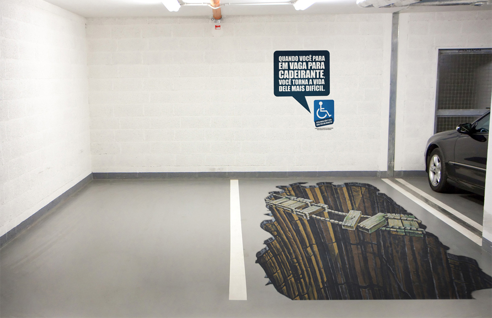 “In Brazil, the disregard for the parking spaces for disabled people is very great. The main excuse used by motorists is: “but it’s only a minute.” So to educate motorists that he is only doing it even more difficult the lives of physically disabled people, was created the following action: In normal parking spaces, was made a 3D illustration of an obstacle that shows you how difficult life even more of a disability.”