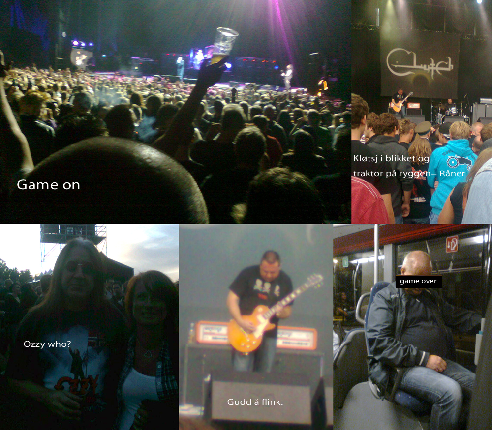 Vorspiel på terasseflyplassen til Kent. Kent hadde bursdag. Guttegjeng med øl i handa og Ozzy i blikket. Det er sommer det er sol. Bare gøtt. Skravler og prater drit i noen timer, før vi går til byn. Kent bor på Lund så det tar ikke mer enn to timer å gå . Maurene beveget seg mot honningen. Hordene smalnet inn og gikk pent å pøntli innover mørkets øy,- Odderøya. Bortsett fra at det fortsatt var sommer og sol. Bonger ble byttet mot penger og en liten grønn gressflekk traff rævva i Odderøya Amfi. Øl, sol og sommer mens Clutch fra USA viste hvor skapet skal stå (akkurat som IKEA). Gudd å flinke. Jeg måtte forsikre meg med Øistein om at de var flinke. Han kan masse musikk mens jeg har rytmesans som en svartsnile. Så forsvant sola og mørkets prins kom. OZZY.