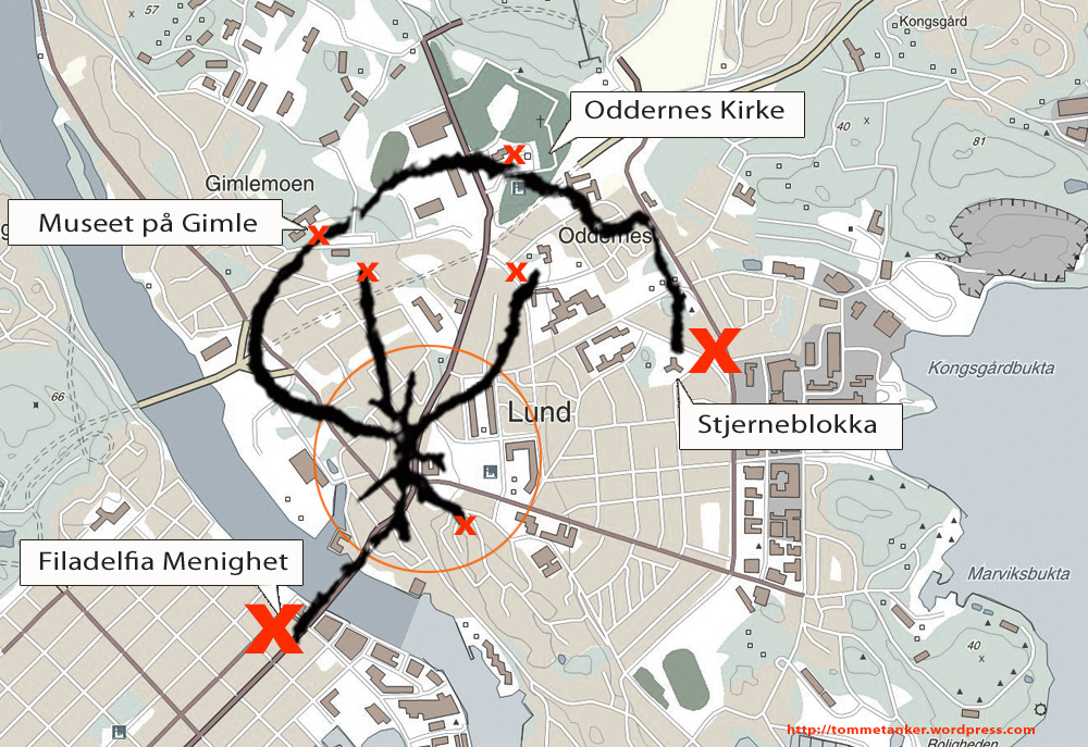 Jeg fant et spor ved en bekk i Randesund. Et blad. Et kart. Det var ikke ment for meg, men det var jeg som fant det. Jeg kjente straks igjen hva det dreide seg om. –Sammenhengen mellom Filadelfia i Kristiansand og stjerneblokka på Lund. Det viser en GPS tracking for utvalgte menighetsmedlemmer. Via Rundingen, Brannstasjonen, Museet på Gimle, Oddernes Kirke og Esson i Østre Ringvei. Det har lenge blitt spekulert i de nære båndene mellom alle disse institusjonene. Er det for eksempel tilfeldig at både Filadelfia og Esso har hus nr. 88. (88 betyr som kjent dobbel uendelighet). Neppe. Men det som forundrer meg er hva som egentlig skjedde på Rundingen. Kartet viser ubesluttsomhet. Avstikkere både til Trymsvei, Hamreheia og Flaten er med på å forvirre den store klarheten og helhetstankegangen. Kanskje vi aldri får svar på dette. Hva skjedde egentlig på Rundingen? Eller kanskje jeg skulle få meg jobb i VG.