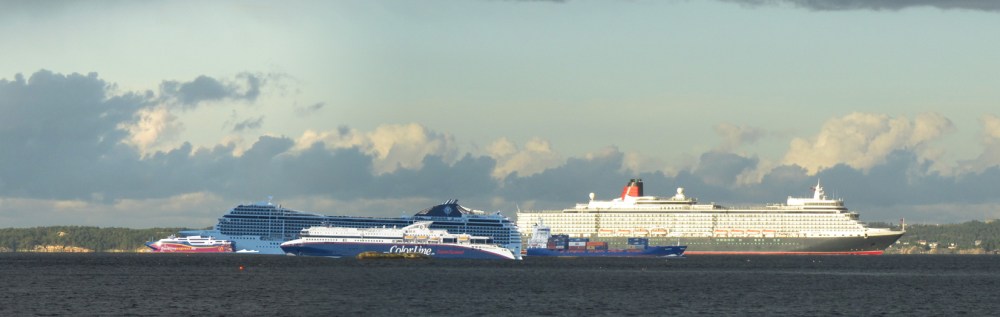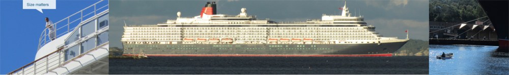 Queen Elisabeth er 294 meter lang. 32.3 meter bredog har et mannskap på 996 . Gjester ca. 2000. Color Lines Super , byens stolthet, blir liten i forhold. Den er jo hele 211,3 meter lang og 26 meter bred. Ikke rart den stikker til havs når slike feiteamerikanermetta cruiseskip arriverer vårt ringe havnebasseng. Og Fjord Cat blir til Fjord Rat. Det er gøy for en liten sjel å se de stolte skipene komme inn. En sommer ved svaberget har noe ved seg.