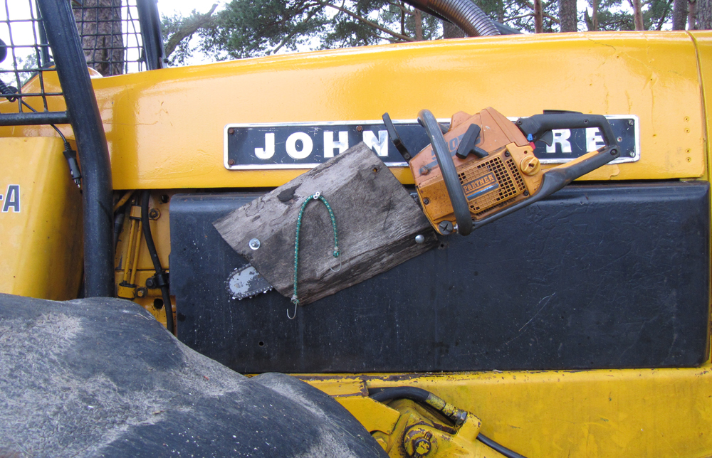 Her en dag så jeg en slik maskin. Diger, slitt og gul. John Deere. Montert på siden av panseret hang den,- motorsaga. I ei slire av en grovt tilsagd stubbe som var bolta fast i maskinen. Gudd å tøft. Jeg så aldri motorsagmannemannemannen som eide den,- selve tømmerhuggeren. Kanskje like godt.