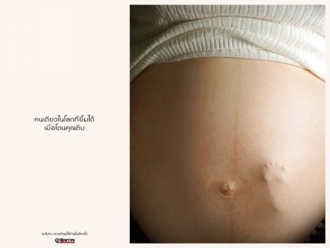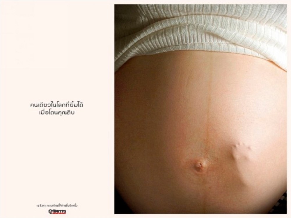 Fra Thailand kommer denne annonsen. Jeg vet ikke hva produktet er, eller hvem som har laget den, men teksten betyr noe sånt som at,- Enkelte blir glad for å få et spark i maven. Stilig foto og mange smiler nok igjenkjennende. Lykkelige gravide mødre føler glede ved hvert spark.
