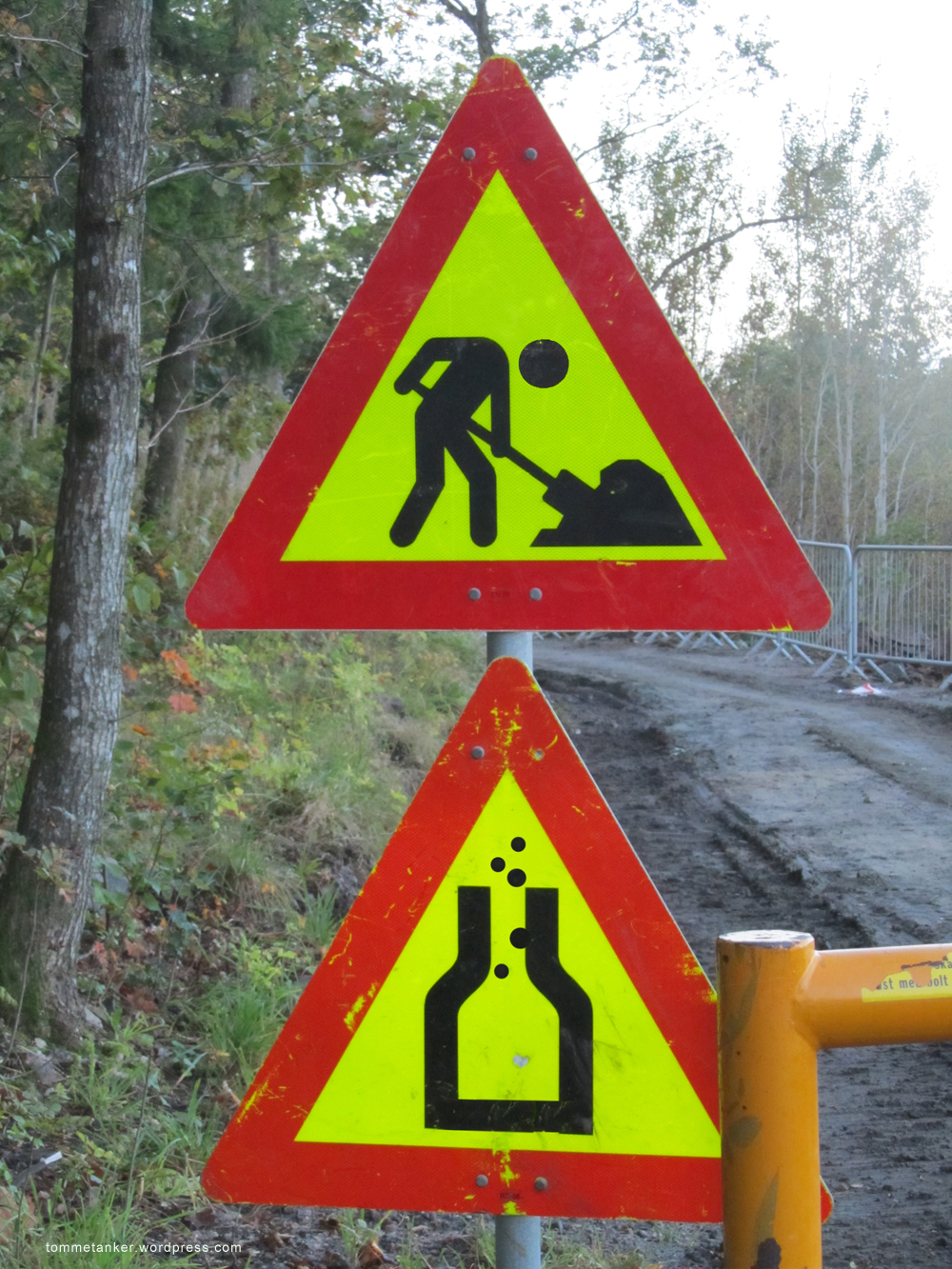 Fare! Livsfare! Min arbeidsvei er på en måde magisk og dramatisk. Av bussen på Bjørndalssletta og et kvarters tusling gjennom skogen til jobb. Skikkelig daredevil stoff for de med mannebein i nesa. Av og til ser jeg en heilt vill blomst eller et psyko ekorn på jakt etter nøddane mine. Noen graver ned fjernvarmerør der jeg går nå om dagen. Dype grøfter med en søtlig eim av nysprengt dynamitt. Men hva er egentlig vitsen med fjernvarme? Jeg vil ha det varmt her jeg er. Hmm. Men det som skremte vettet avmeg denne dagen var fareskiltene de hadde satt opp. To rødinnramma illevarslende trekantskilt som sammen advarte mot slitne beduggede anleggsarbeidere på veien. Og skiltet lyver i tillegg. Det blir ennå ufattelig mye verre. Jobbemenn i dag av denne sorten har ikke spade. De har masse hestekrefter og skumle maskiner og knapper og sager og grabber og saggebukser og skrujern og slikt. Har de seg ei flaske 60 i tillegg blir det nifst. Jeg snudde og gikk en omvei.