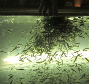 små bassenger foran to stoler. “Hmmmm!” tenkte jeg. “Ka e detta.” ” Fotbad?” I så fall for de som allerede har skitne bein. For vannet såkke bra ut. “Try,- mister boss”,- sa en hyggelig dame. “Put hand in water,- mister boss”. For første gang i mitt unge liv ble jeg kalt for mr. Boss, så det sier seg selv at jeg gjorde som hun sa. Uten frykt og trengsel stakk jeg handa nedi…………GUDD! Den kom fortere opp enn den gikk ned. Handa hadde umiddelbart blitt angrepet av små fisk som var i vannet. “SHARK!”. Om enn bare 10 mm lange, så -“PIRAYA!” skrek jeg, og besvimte. Ved min egen oppvåkning ble jeg fortalt at dette var småfisk, og ikke hai. Heller ikke baby piraya. Småfisk som spiste opp døde hudceller og på den måten renset de beina som egentlig skulle settes oppi dette dødens akvarium. Jeg testet ikke dette ut lenger. Hjertet mitt tålte ikke mer.