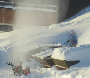 glatt. Men vi kom opp. Trykket på portåpneren, kjørte inn i garasjeanlegget med egen skibod og smørebod og tok heisen opp til andre etasje til en oppvarmet leilighet med trådløst nett, boblekar, saueskinn og utsikten på bildet over. Merkelig følelse. Har ikke opplevd slik luksus på fjellet før. Ekstra bonus denne morgenen var mannen som skuffet fri noen containere. Han stod og heiv snø ned i snøfreseren og ble selvnedsnødd igjen. Det kunne vært meg.