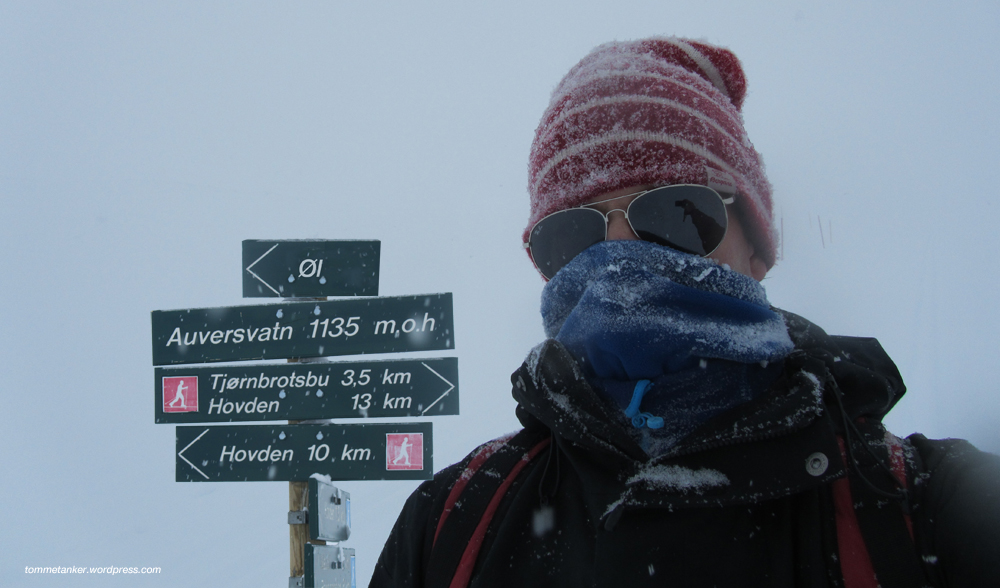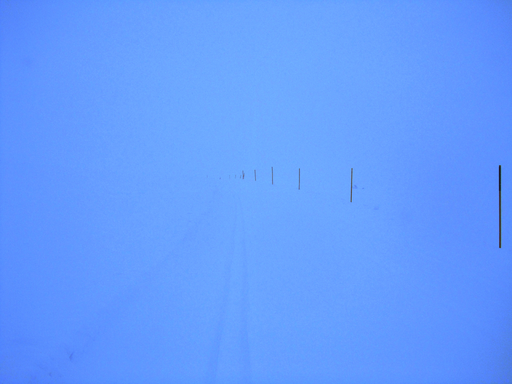 snøvær og null sikt fulgte jeg skiltene, og stakene, innover. Snart så jeg bare hvitt. Over tregrensen så jeg kun løypestakene. Ingenting annet. Gudd å hvitt. Gudd å fritt. Gudd å stilig. Jeg var i himmelen. Hvitt overalt. Untatt disse evige strekene innover som viste meg vei. Men kaldt. Jeg gikk 23 km i den tro at det var øl i andre enden, før det endelig gikk opp for meg at skiltene var selvopphengt.. . . . . . .