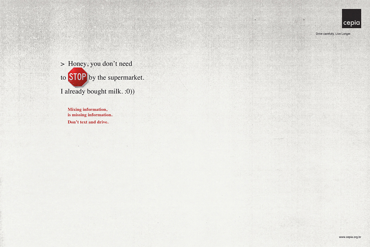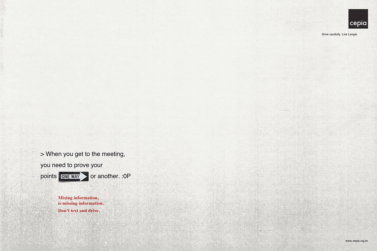 Reklamebyrået Africa i São Paulo, Brazilmed Art Director Humberto Fernandez står bak denne smarte kampanjen. Kjør forsiktig,- lev lenger. Enkelt og greit. Lett fattelig budskap og visuelt genialt forklart. Hill, hill. Det gjelder oss alle. Ikke tekst sjøl når du kjører. Stopp når telefonen ringer. Si i fra når sjåføren du sitter på med surrer med andre ting enn å