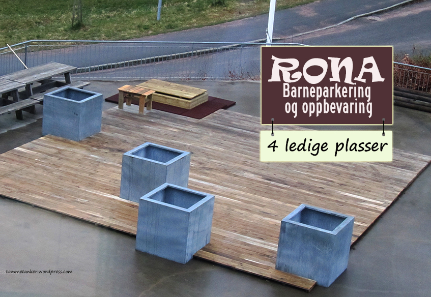 Rona barneparkering. Av og til må en trø til. Når sønnen skal på trening og miste tenner mens svigerdatter er på senvakt på Glitter er det godt å ha meg. Mr. Kindergarten. Barnehageonkelen over barnehageonklene. Barnas venn. Verdens beste bestefar. Jeg er født med naturens nådegave. Jeg er på bølgelengde med disse menneskene under meteren. Jeg leser deres tanker og vet hvordan de skal underholdes og sysselsettes i foreldrenes fravær. Det gjør meg ingenting at de sugler, bimmelimmer og bommelommer i hytt og pine, hyler eller prøver å stikke av. Alt en trenger er en stor tom blomsterkasse, og et passende lokk.