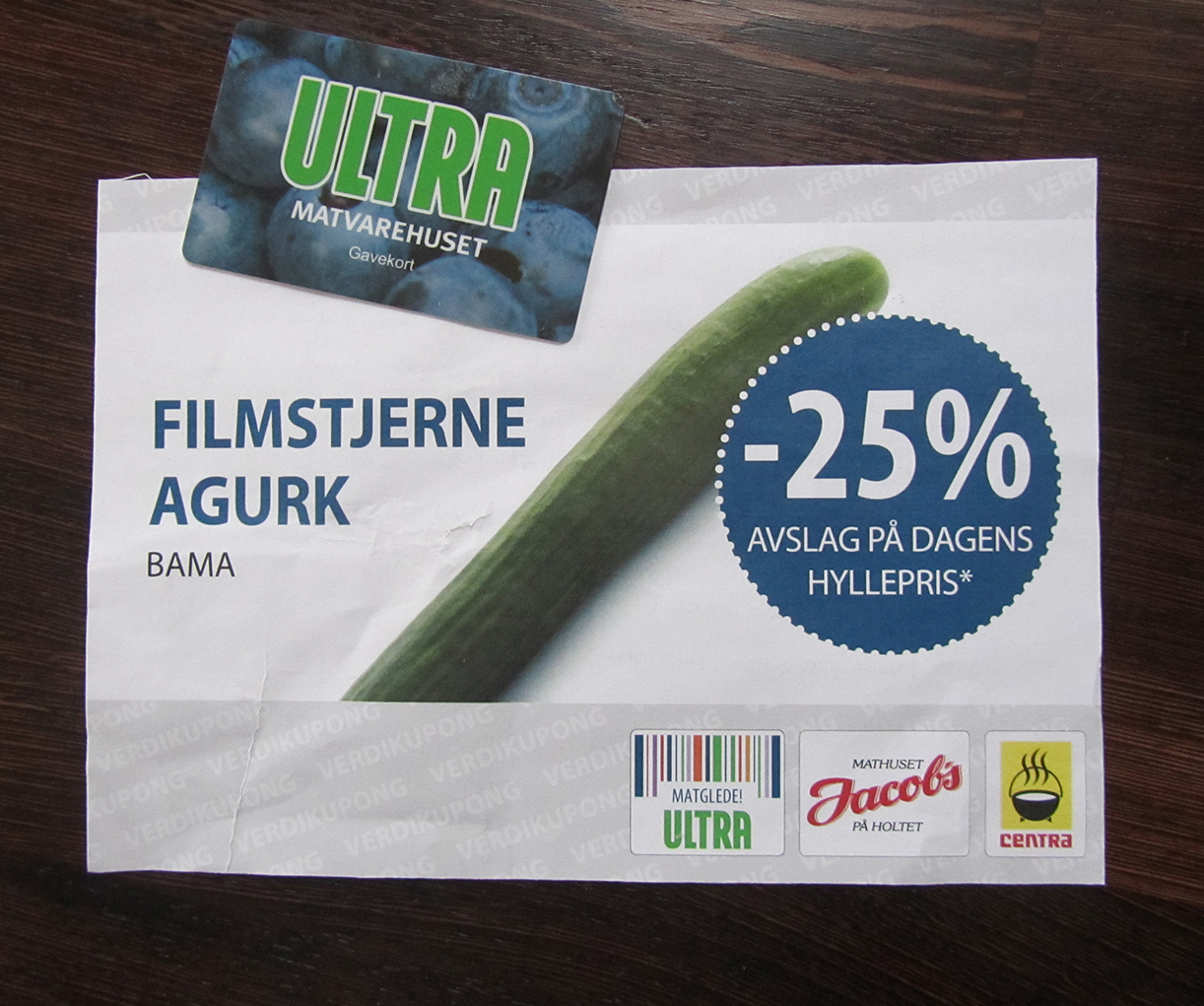 Alt hva en filmet Agurk kan sette i stand. Etter et Tommetanker-innlegg ( https://tommetanker.wordpress.com/2012/03/11/indecent-proposal-fra-butikksjefen-pa-ultra/ )om ikke å få Trumftilbud fra Ultra Sørlandssenteret fikk jeg et gavekort fra nettopp dem. Hyggelig, men merkelig. Det er jo uvanlig at mennesker setter pris på kritikk. Men det gjorde de og tok det ad notam, og takket, og bukket, og sendte meg et gavekort til butikken. Takk Ultra for gavekortet, muligens jeg bruker det på en filmet reddik.