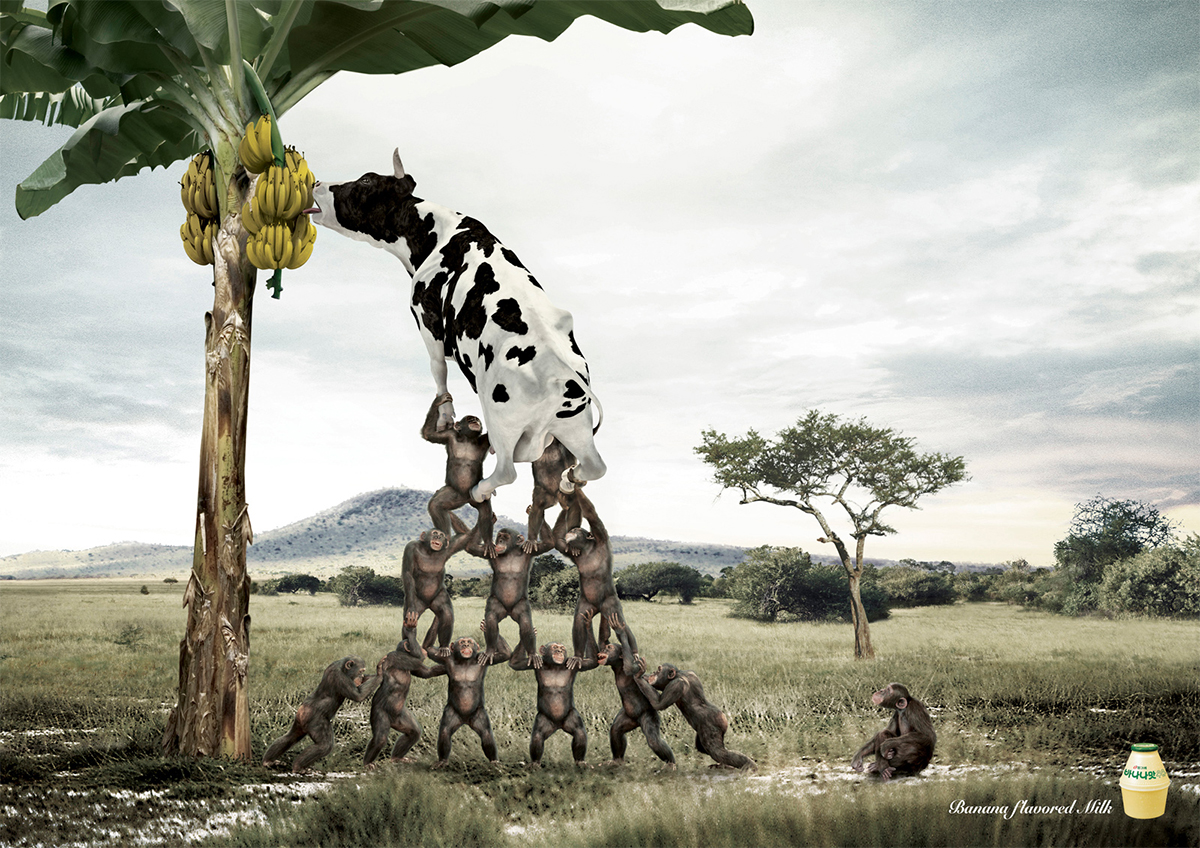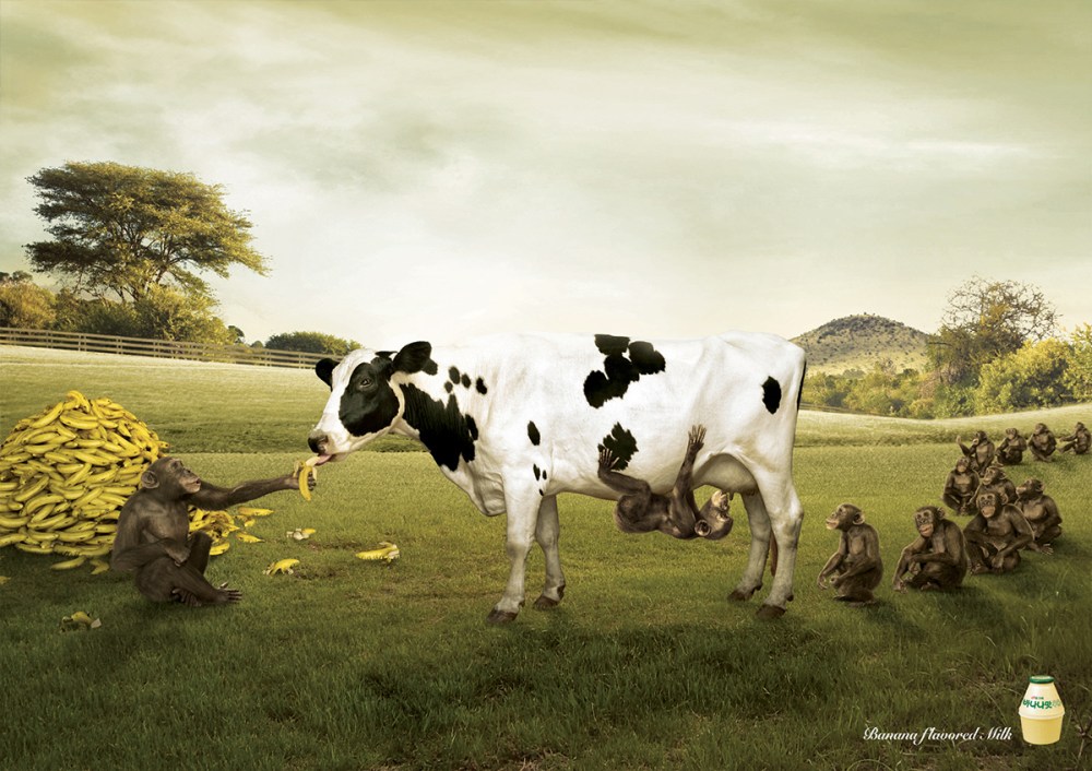 Humor i annonser må man ha. Og fra reklamebyrået Cheil Worldwide i Seoul, Sør Korea kommer vedlagte annonser. Melken med banansmak kommer jo selvfølgelig fra kuer som blir foret med bananer av apekatter. What else? Flott foto og bra manipulert. Art Director Giho Lee har gjort en enestående jobb, eller som æ sier; Godd å bra.