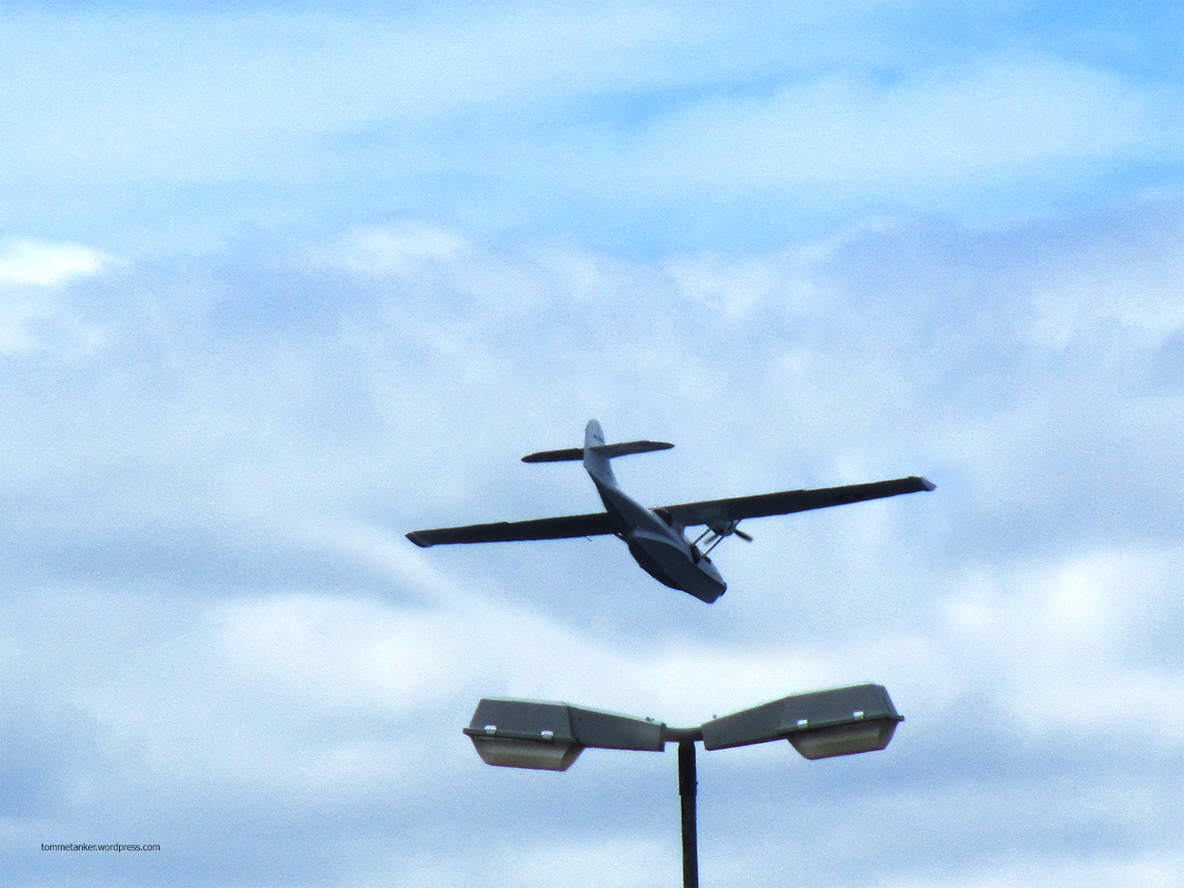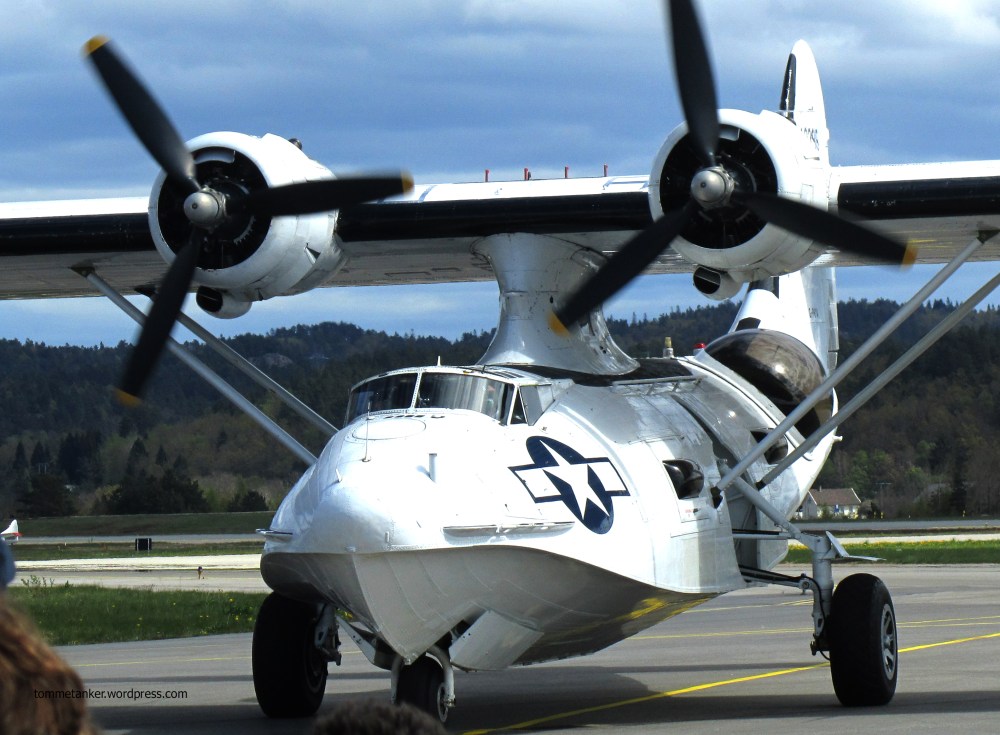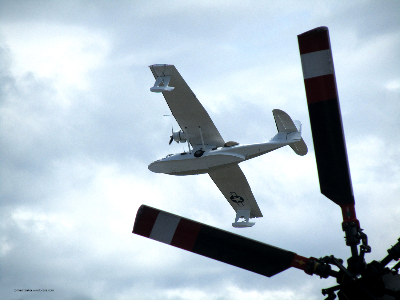 På Kjevik her en dag var det flyshow. Og masse gøy. Hoppeslott, dårlige burgere og biltemautsalg ble oversett, og motorer, fly og entusiansme ble fokusert på. Jeg ble til og med invitert ned i en cockpit av en ung kvinnelig soldat – – – – . Hvor kommer egentlig ordet “cockpit” fra. Men for meg var det en gjeng med flyentusiaster fra England som ble min vinner. De kom med et fly som hverken innbyr til fart eller spenning sammenlignet med de andre. Men gudd for en LOOK. Best in show. Et fly som trives på land og i vann. På asfalt og gress. Kult. Det heter Catalina og er en gammel dame med sans for å slukke branner. Uten å stoppe kan det på store sjøer fylle buken med vann og hjelpe med slukking av skogbranner. Gjengen i England som elsker det og holder det i live fortjener all ære. Hill, hill.