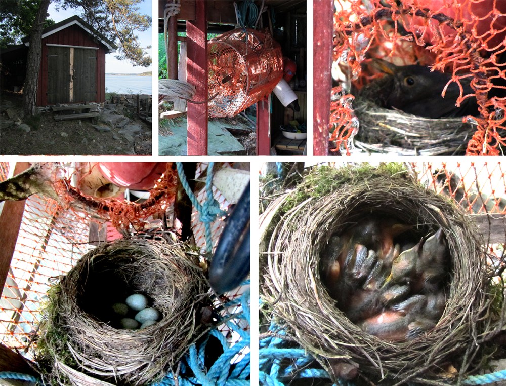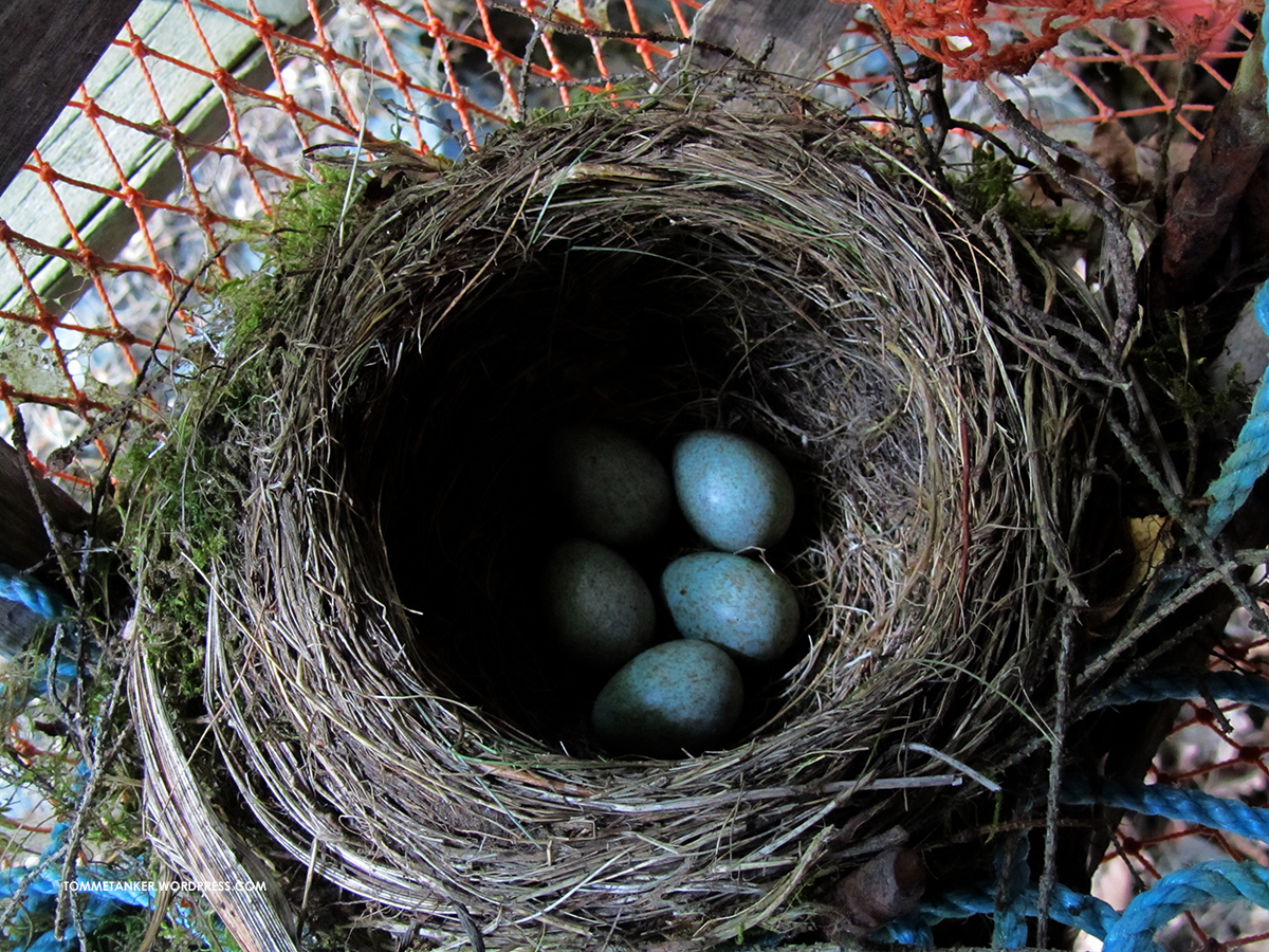 skapning fra dypet skulle møte sin sjebne i hyttekrabbegryta. Pappa skulle hente ned teinene fra sjøbodveggen, slik at de kunnes vannes etter 6 måneder i vinterdvale. De skulle klargjøres for nye utfordringer i dypet. Min far så for seg kokrøde krabber med majones og snadder. Men slik ble det ikke. I hvertfall ikke ennå. En trost ville det anderledes. Den har nok saumfart området etter en trygg redeplass da den fikk øye på teinene under taket. Hvilken god ide for en vordende mor. Det kunne vel neppe bli sikrere enn dette. Fin utsikt fra et lunt rede, og totalt utilgjengelig for de skumle kråkene og måkene. Og vi kan følge med på naturens under,- egglegging, klekking, mating og flyskolering. Kult.
