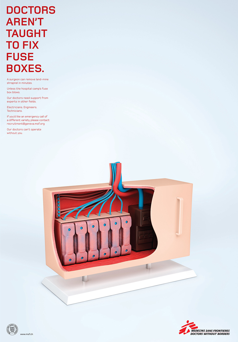 . Kjent visualisering av menneskekroppen er flyttet smakfult over til ikkelege ting. Men som leger både med og uten genser og grenser må ha for å gjøre sine legeting. Annonsene er laget av et team fra Australia og Sveits med Art Director Olivier Girard go Graham Johson i spissen. Hill, hill.