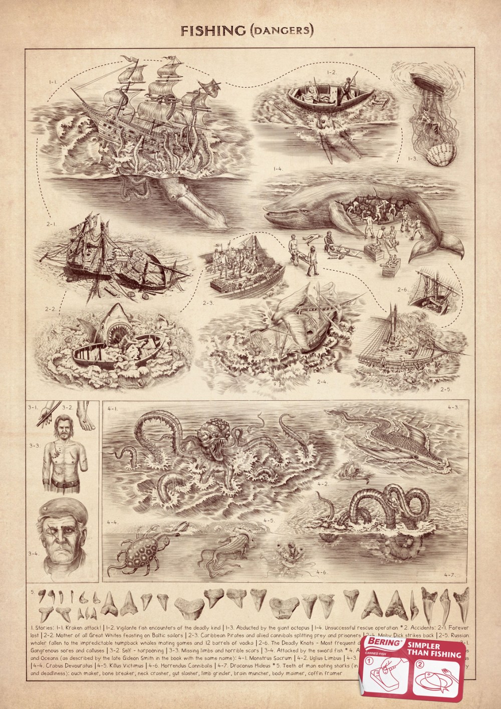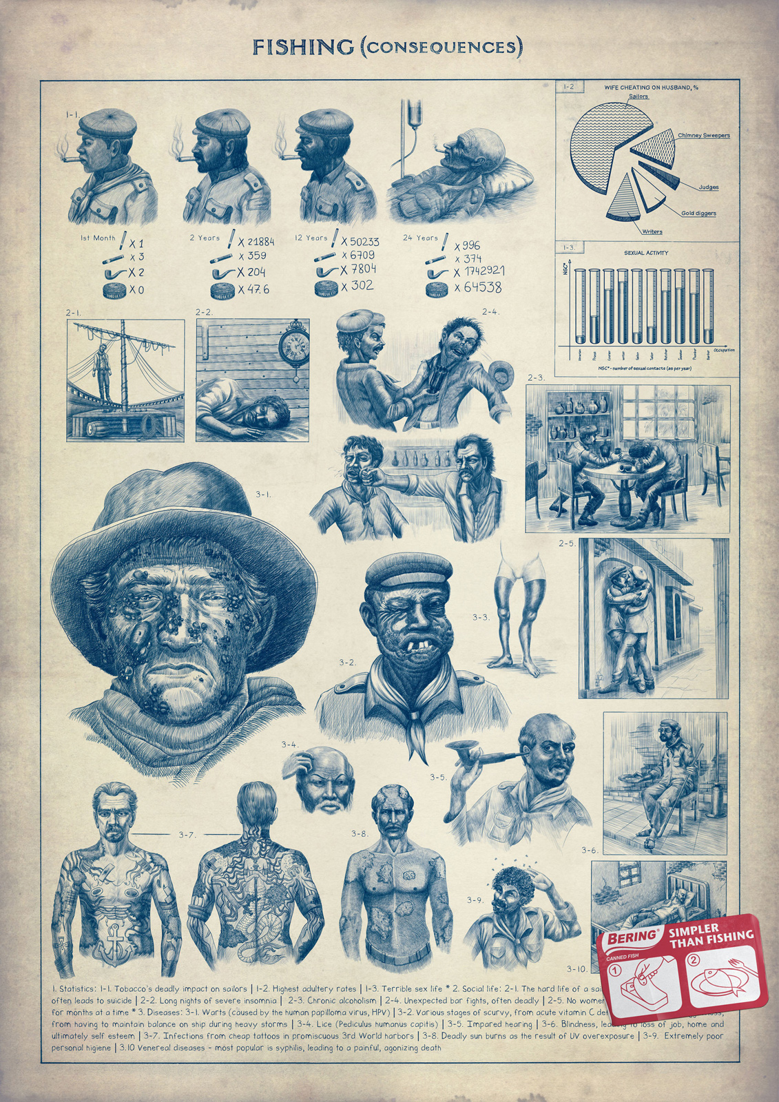 Fiskere har dårlig hygiene. Fiskere er utro mer enn gjennomsnittet. Fiskere dør oftere av røyking enn gjennomsnittet. Fiskere blir mer solbrendt. Fiskere får mer lus. Fiskere hører dårling. Altså lønner det seg å kjøpe hermetisk fisk. He,he . Hvilken utførelse på en absurd ide. “Enklere enn fisking”. Reklamebyrået BBDO i Moskva, Russland Har laget enn kampanje jeg smiler av. Visst er det enklere å åpne en box, enn å fiske selv. At det smaker like godt er det vel ingen som biter på, men utførelsen, og leken med statistikk og fiskeres slit og strev og væremåte er brilliant. Hill, hill. Art Directors Oleg Panov, Max Kitaev, Mihai Coliban har gjort en god jobb. Men uten en fantastisk illustratør i Nishikant Palande hadde det ikke funka.
