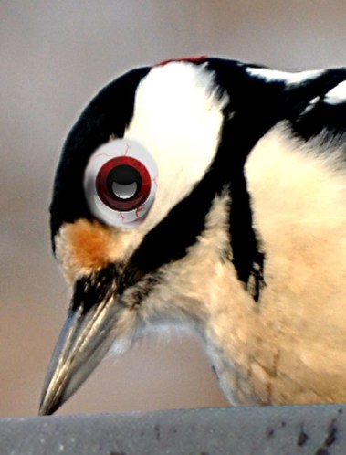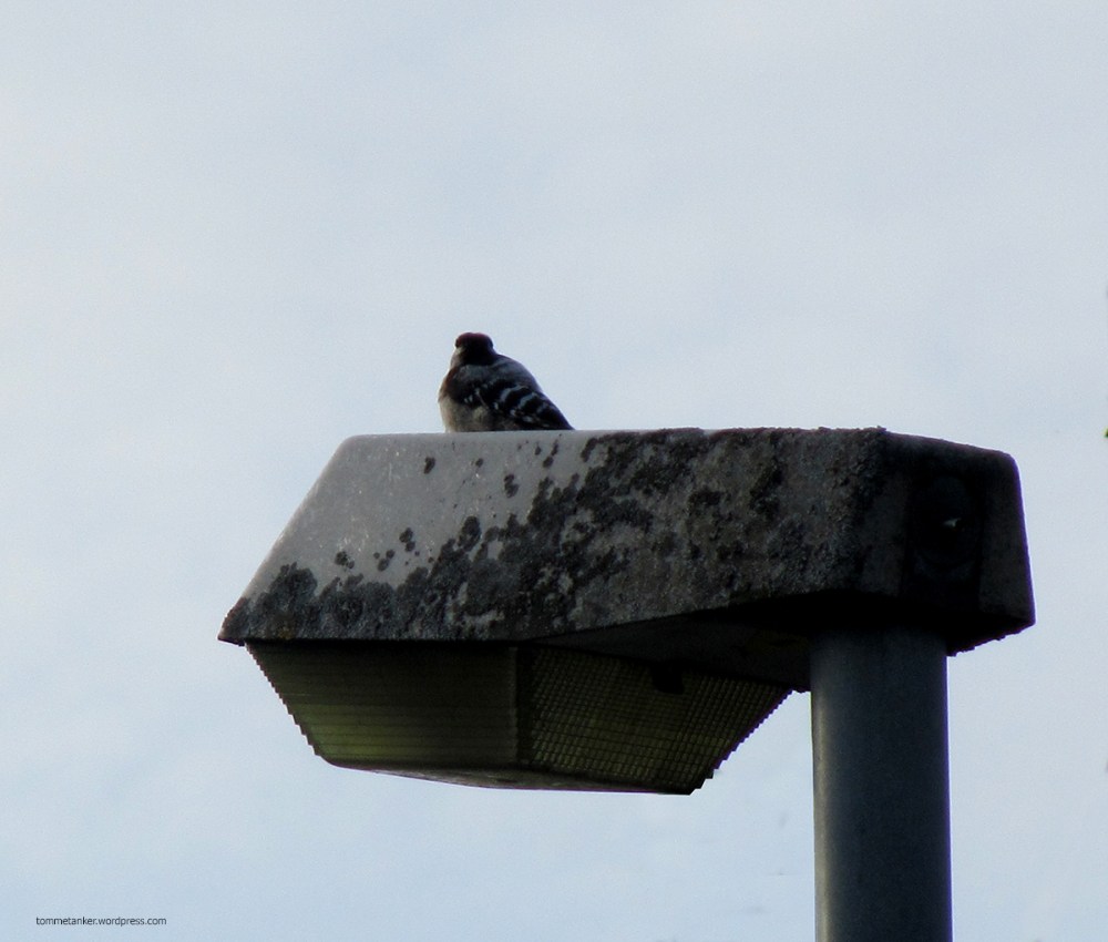 for Ding, Ding, Ding, Ding, Ding, Ding. Jeg stod opp, snøvla i teppekanten, klødde meg i øret og tok meg en kaffekopp. Hele tiden med Ding, Ding, Ding, i det fjerne. Etter en halvtime låste jeg døra på vei til bussen. Ding, Ding, Ding, kom litt nærmere. Ding, Ding, Ding. Og der så jeg opphavet til lyden. Ding, Ding, Ding. Faenskapet satt på toppen av ei metalllyktestolpe. Ding, Ding, Ding. En lobotmert, dessillusjonert, sosiopat av en Hakkespett satt å hamra løs på metallet.Ding, Ding, Ding, Gudd for en sær fugl. Sikkert rømt fra en eller annen institusjon for hyperaktive hakkespetter med tinitus og malingblander-frekvensetterligningssymptomer. En ting er sikkert. Ser jeg den igjen, er det ingen andre som vil se den igjen etterpå.