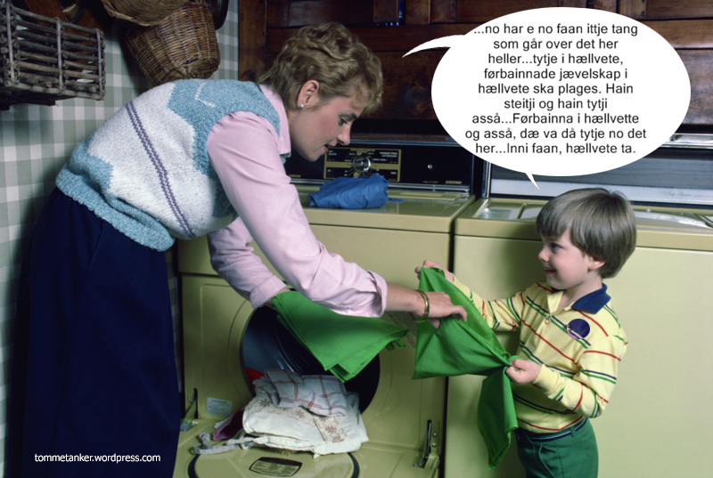 evig fortapelse i sør. Jeg hørte det første gang på en kasett som svigerfar kom med. Sikkert 25 år siden. Svigerfar er nordlending av den ekte sorten, svigermor og. Første gang jeg besøkte heimen deres i nord og svigermor kjørte meg til sentrum, kom det så vart fra hennes munn da en fotgjenger forsøkte å gå over: ” Førbanna hæstpeis, -se dæ førr!”. Karen på opptaket er fra Saltdal og det var visstnok sønnen som i hemmelighet tok opp farens forsøk på å fikse vaskemaskinen. Kulturarv av ypperste merke.