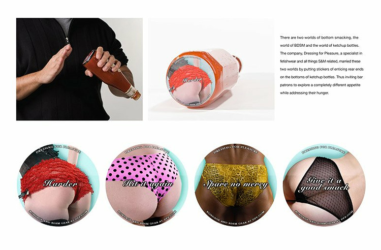 He, he. Ikke akkurat hyllevare hos Rema 1000 eller KIWI på Lund men du verden for en anderledes ide. Dressing for Pleasure er det nok noen av mine fornektende venner som kjenner. Det er et firma som lager ting for fetish-markedet, for SM folk. I slike miljøer har de tendenser til å like å bli slått, og å slå. Rett og slett klaske til folk på de mest oppsiktsvekkende kroppsdeler. Og her tar de altså sin klaskeerfaring og sine klasketeknikker og overfører dem til matbordet. Små klistremerker av smektende frekke dame- og herrerumper anbringes på bunnen av ketchup flaska. Og vips er flaska tom på første pølsa – – -. Say no more.
