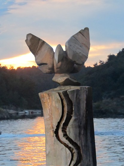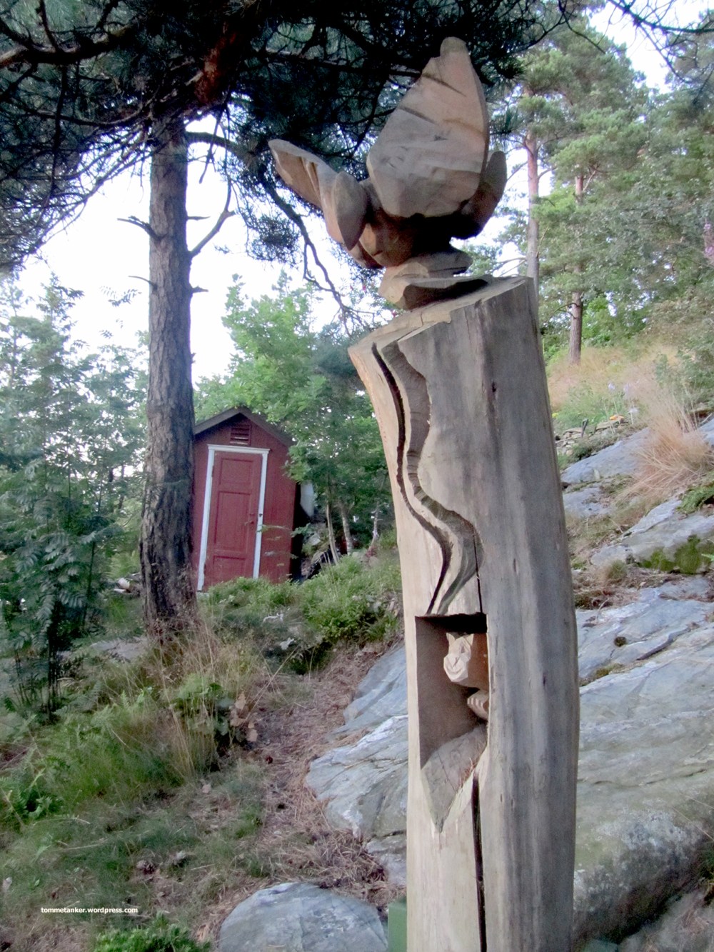Sitatet er risset inn, rosemalt, tegnet og pyntet på mang en utedo i Norge. På hytta har vi utedo. Et koselig lite 2 m2 hus 10 meter vekk fra hytta som innbyr til fred og ro og ettertanketid. Samt litt bimmelim og bommelom. Utedoen er kun til sjenanse ved feil vindretning på fuktige dager. Eksotiske odører kan komme svevende på vinger gjennom luften. Men innovativ bark og kalk løser også det problemet. Like ved doen står vår totempåle, eller tommpålen som det heter her. Den dukket frem av en bjørkestokk som en gang ble hugget på Stemmane. Etter å ha sagd og kløyvd om trent 50 stokker begynte jeg å lure på hva som var inni stokkene. Jeg stoppt opp og så meg rundt. Og der lå det en stokk utenom det vanlige. Tjukk og strunk og stram. Stokken lå der og jeg begynte bare å fjerne, sage og hugge vekk overflødig ved. Da dukket den frem, denne bevingede beskytteren med en kattaktig hjelper. Kanskje et ubevisst bilde på meg og Maya. Hmm.