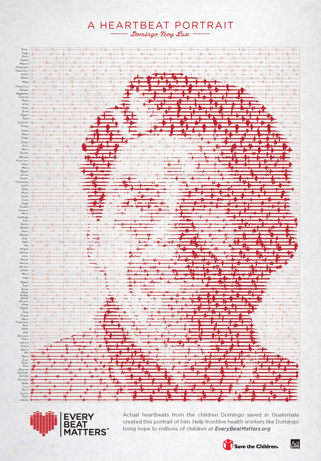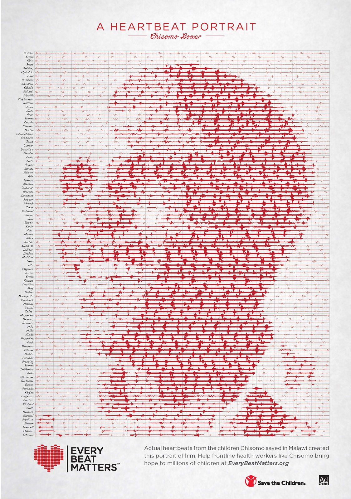 hjerter kan slå mer og fler slag. Annonsene her viser portretter av hjelpearbeidere som har reddet liv. Fra Guatemale til Malawi. Og portrettene er kunstferdig laget ved hjelp av barnas hjerteslag. Merkelig ide, men fin allikevel.