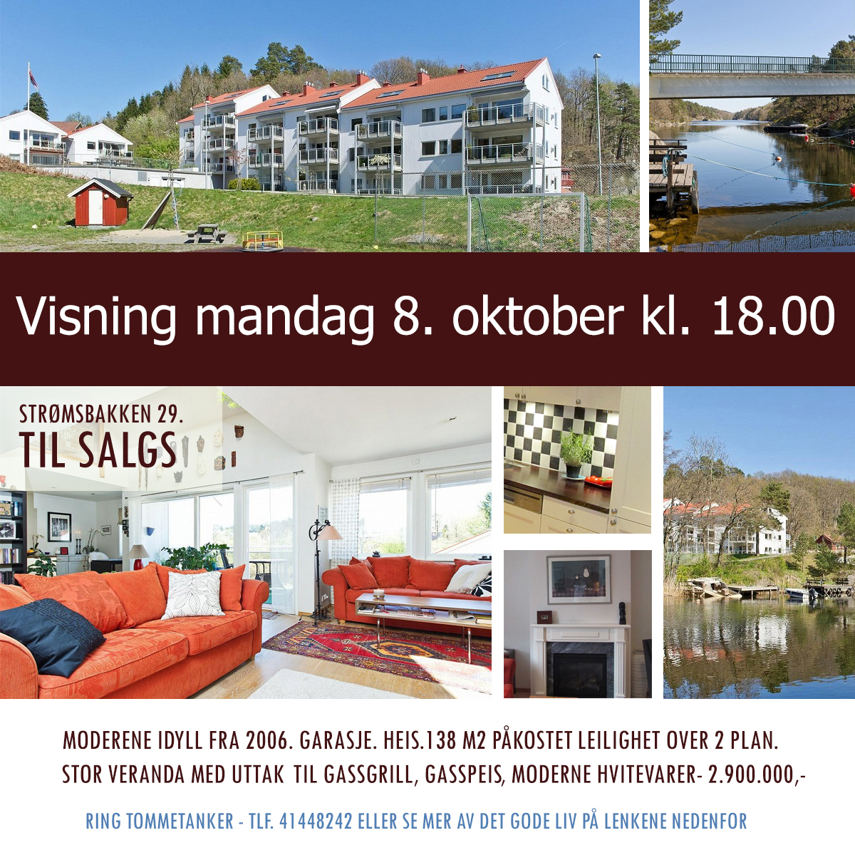 Vi selger vår deilighet av en leilighet. Vår flotte 2-etasjers leillighet like ved idylliske Strømskanalen. En liten bortgjemt hemmelighet er vårt lille boligsameie. 24 leiligheter i enden av en vei med strandlinje mot Drangsvann og Strømskanalen. Bare sykler passerer over gangbroen over kanalen. Lekeplass er like ved. Vi har parkeringsgarasje og heis opp til leililgheten i 3 etasje. 138 m2 over 2 plan. Vi har kost oss med stor plass og 2 soverom.
