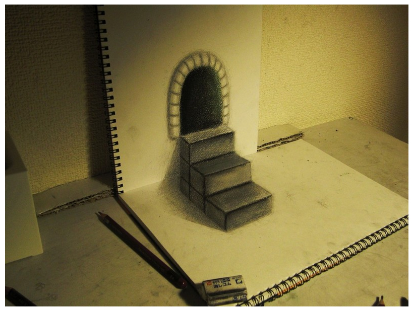 og tegningne til en illustratør. Han var flink, – veldig flink, men tror kanskje han har lært av han her. Nagai Hideyuki fra Japan.Den 21-år gamle japanske kunstneren Nagai Hideyuki skaper fantastiske skissebok tegninger som sett fra riktig vinkel gir en realistisk 3D illusjon . Unge Hideyukis arbeider er blandt de aller beste i denne sjangeren. Ved hjelp av en teknikk som kalles anamorphosis,klarer han å skape illusjonen av at noe kommer ut av skisseblokken hans. Inspirert av streetart kunstneren Julian Beever satte han i gang med å lage 3D-kunstverk. Streetart er ulovlig i Japan så da ble det skisseblokka som ble hans lerret. Hill , hill fra Tomm.