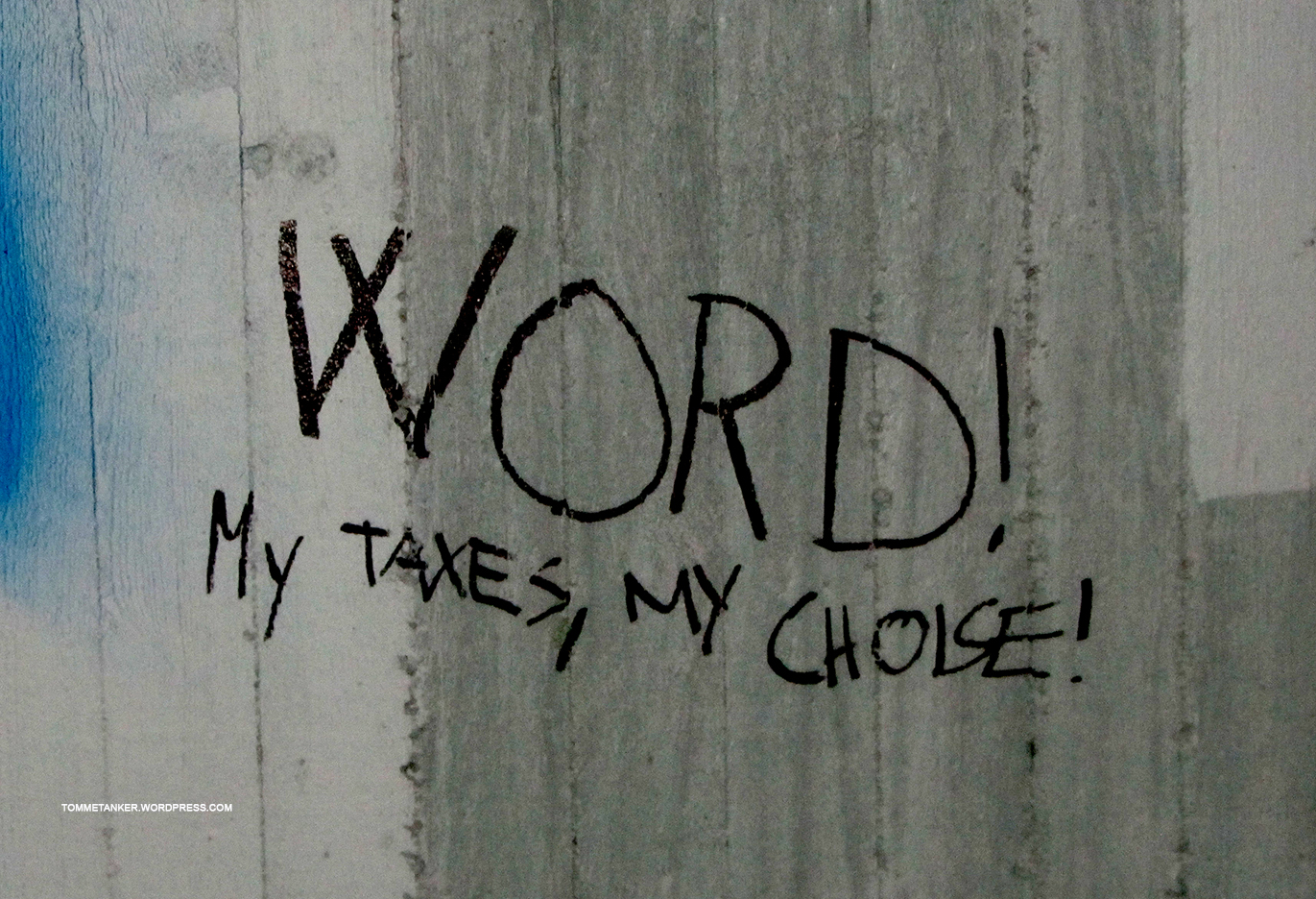 NO TAX skriver en tagger i en undergang. En med fritid nok og sprayboks i lomma. INGEN SKATT. Budskapet er ikke utdypet så jeg antar det gjelder generelt. Ingen skatt på noenting. Alle klarer seg selv. En liflig tanke,