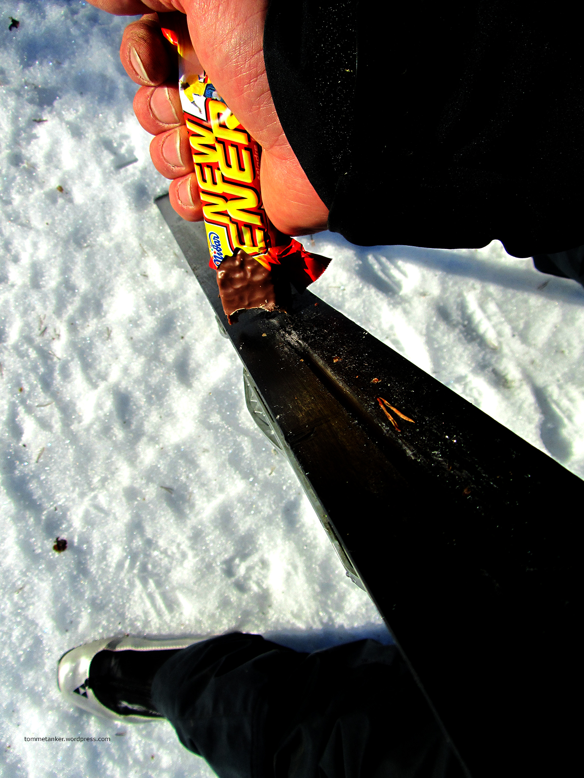 Som regel på skitur smører jeg meg selv med tålmodighet. Av og til med solkrem og en sjelden gang med riskrem. Hva skiene får er basert på vitenskap , tilfeldigheter og flaks. Sist f.eks.: I det jeg stiger ut av bilen på skiparkeringsplassen klar for dagens løype-slit kommer det en skisvusjer lett joggende tilbake fra sine syv runder i 5 milsløypa. Ski og staver ser like spreke ut som han. Allikevel drister jeg meg til å spørre: “Fin tur, god glid, hva smørte du med?” og håper han vil nedverdige seg selv til å svare en amatør med ikke så tettsittende bukser. “V45 passer bra i dag” sier han i møtekommende. “Hæ?” sier jeg. “Hesteveddeløp?” og ser for meg vedkommende i gallopp med ski og tights og briller og lue med DNB logo hoppende innover i skogen. Han himla med øyan, smalt med bildøra og vekk var han. Jeg stakk en finger i snøen og en opp i lufta og smurte med rødt. Funker alltid. Av og til er det godt feste, og av og til er det altfor godt feste. Turen blir uansett alltid fin og jeg har alltid en sjokolade med i lomma som belønning og smøring for godt gjennomført halveis tur. New Energy. Eller New Enerski som jeg kaller den. Passer til alle slags forhold og bør finnes i alle smørekufferter og rumpetasker. Litt i munnen og litt under midten av skia. Perfekt.