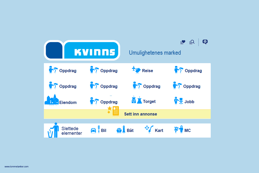 Ny, og mer reell tjeneste lansert. Store og små erkjennende markedsundersøkelser og mannlige forutanende observasjoner har realisert seg nå i en ny og mer brukervennlig netttjeneste for et hvert ekteskapelig hjem. Denne touch-skjermen plasseres sentralt i ditt dannede hjem. Her, hvor noen av oss ikke har tilgang, kan det pålegges ulike kriterier som ikke er diskuterbare. Ei heller søkbare. Din oppgave er å klikke “Accept”, “Jeg godtar betingelsene” (ofte allerede gjort ved alteret) og så la det bli med det. Herretter vil noen av oss motta beskjeder til obligatorisk oppfølging. Du vil etterhvert og overlykkelig se at oppdragene strømmer på, eiendommen vokser, Torget skifter etterhvert navn til Interiør og valget “brukt” fjernes. Reise er ikke lengre valgfritt og Jobben forblir uendret til det motsatte blir bestemt.