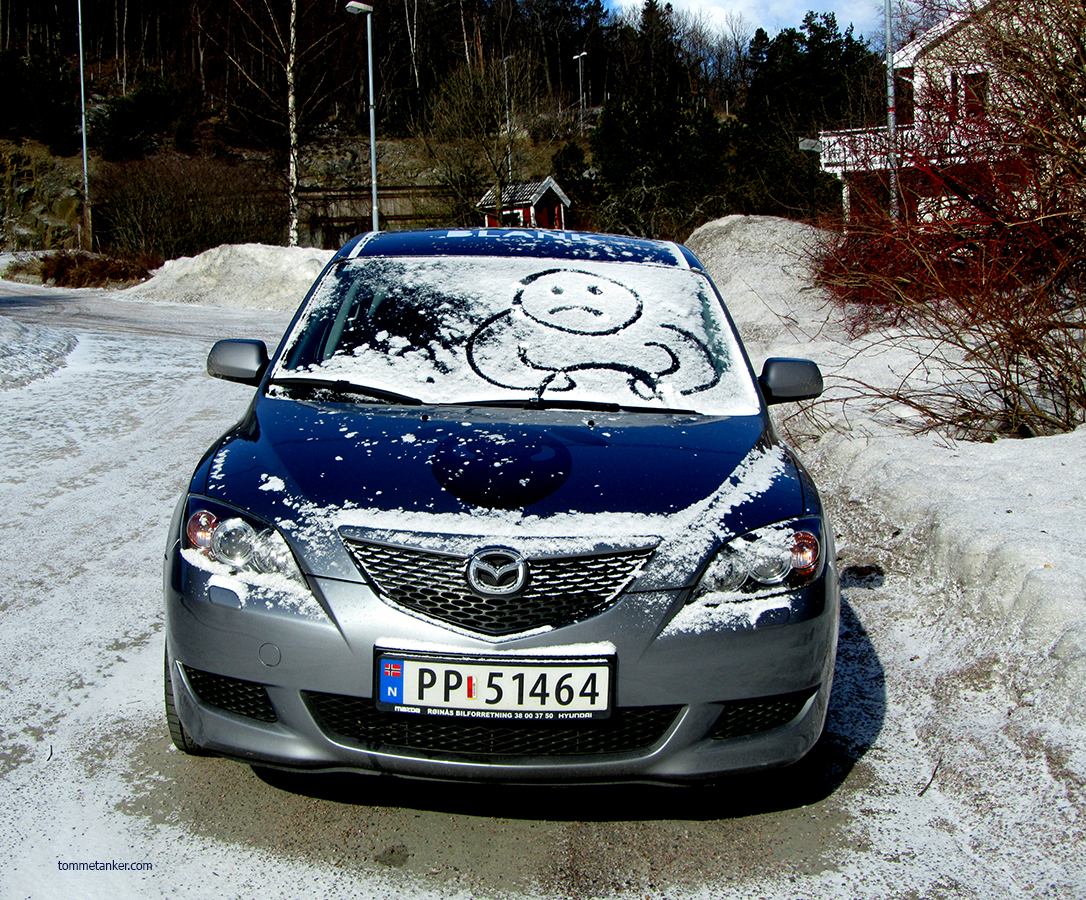 sur_bil_tommetankerJeg sier som Frank, en venn av meg, vekk meg opp i juni. Dersom Yr og Storm og Gislefoss og pigene i TV2 får rett så blir jeg gal. Jeg som elsker snø hater den i år. Jeg elsker å gå på ski og alt det hvite og fredelige som snøen tar med seg. Men i år bygger jeg hus. Snø og frost har allerede utsatt alt i 2 måneder. Og nå har de meldt mer. Gudd. Gi meg styrke.