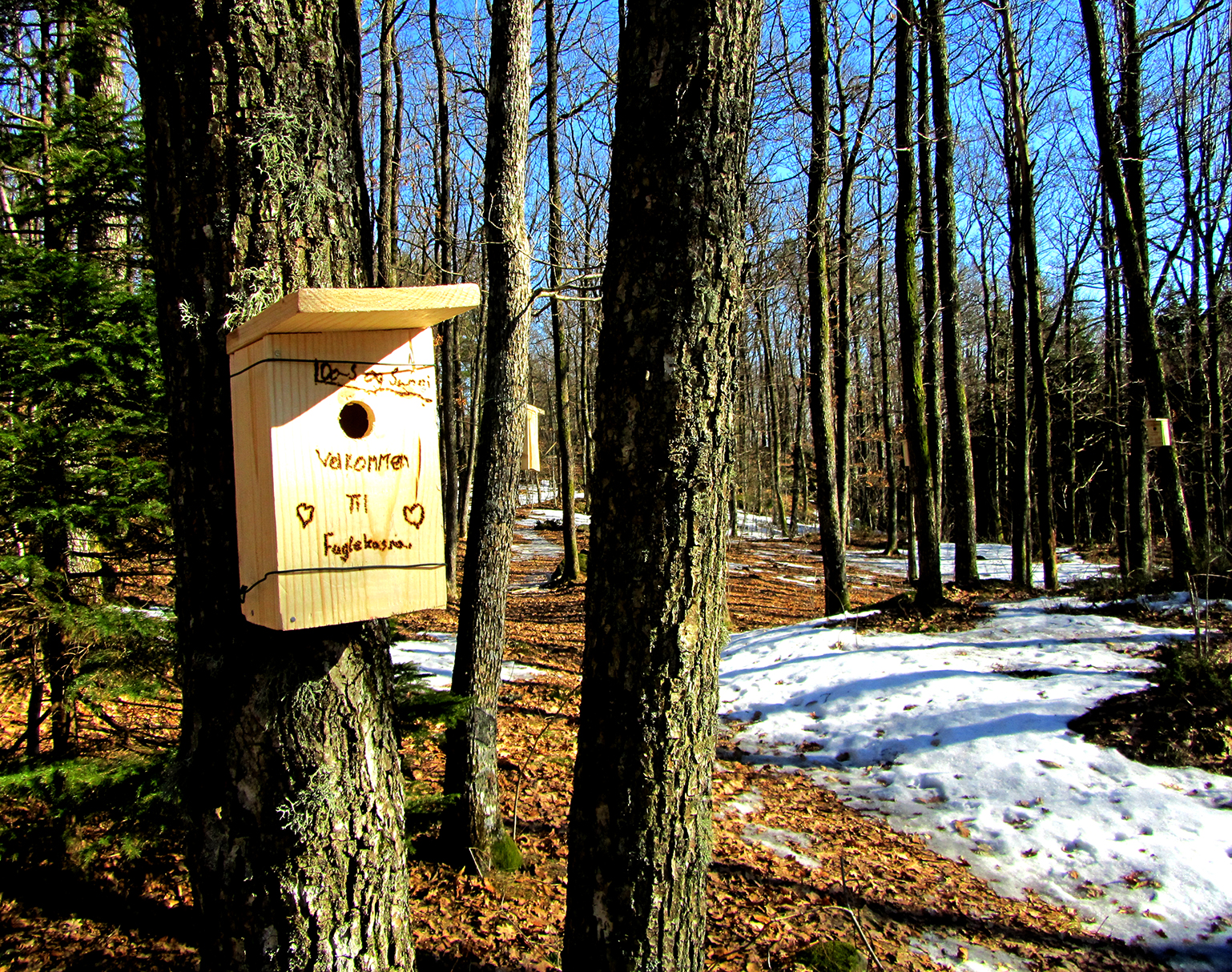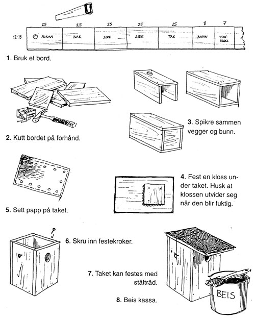 Oh glede. Skulle ønske jeg var en kjøttmeis. Det vil si å veie 80 kilo mindre enn nå. Leve på en lavkarbodiett bestående av alt hva Grete Rhode anbefaler,- smuler, makk, mygg og frø. Jeg skulle ønske jeg kunne flyhøyt på lavkarbo, og jeg skulle ønske jeg kunne lande i åpningen av en av disse fuglekassene. I en skog like ved der jeg bor fant jeg disse. En fuglekasseskog! Et nytt lite nabolag for småfuglene. Trygge ruge- og redeplasser hengt opp av en gjeng med barn. Og hvilket tiltak. Jeg blir så glad når barn er med på slike ting. Istedenfor PS, Wee, x-box og TV. Lag ei fuglekasse. Fine ting for folk, fugler og skog. Og fin ting for Tomm i tommetanker. Lag en fuglekasse! Klikk på bildet under å få inspirasjon!