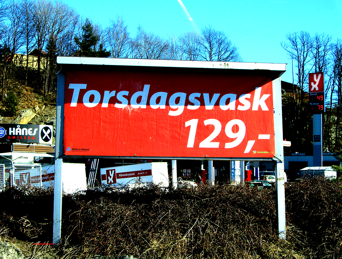 Torsdagsvask! Ikke personling. Jeg har jo annenhver tirsdag som min hygienevaskedag. Må ikke vaske meg for ofte for da forsvinner alle de skitne tankene. Men. Nei, dette handler om torsdagsvask for bilen! Fra 129,- på YX Hånes. Søle og salt, suppe og kaldt. Bilene skifter farge og karakter i takt med gradestokkens jo-jo politikk. Blank og fin blir til grå og grin. Men da har vi vaskehallen på tappen som står klare til å lage bilen fin igjen mot en hviss godtgjørelse. Jeg gidder ikke bruke svamp og såpe og slange. Jeg kjører inn i vaske hallen og etter 10 minuttersmirakuløs bilschpaa er bilen rein. Men aldri på en torsdag. På torsdager kan du vaske bilen for 129,- kr. Spar en 50 lapp! jippiii. 5o spenn sparer du. Det er da jeg lurer på disse bilene og folkene inni dem. For å spare 50 kroner sitter de og venter i en time og enda mer. Gudd å gøy på tomgang. Kanskje de har svigermor på besøk? Kanskje de har troll til kjerringer? Kanskje de har en vaskehallkøfetisj? Kansje de er fulle?Kanskje de bor i Vågsbygd og tror de er på vei hjem i rushtia? Jeg undres. . . . .