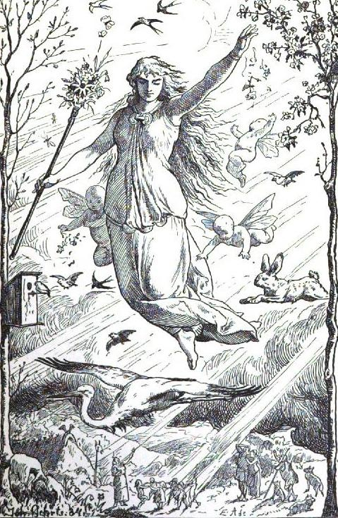 detalj om den utenomhellige som blir hellig er den Angelsakssiske gudinnen for daggryet, våren og fruktbarheten.,- Éostre. Også kalt Éastre, som er opphavet til det engelke ordet for påske,- Easter. Eastre på sin side hoppet til køys med Solguden som går opp i øst (east). Éastre sine symboler var haren og egget. Begge representerer jo fruktbarhet og dermed gjenfødelse. Festen til hennes ære var sånn ca samtidig med den kristne høytiden påske og smeltet sammen på et tidspunkt. Fest er fest.