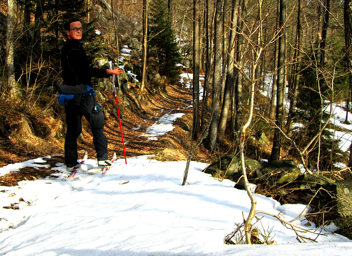 Skulle du ha sett! En frekk faen har vært i skogen og nappet vekk 40 meter av løypa mi. Mine varig svekkede etterforskningsevner umuliggjør også en løsning på mysteriet. Jeg får heller ta med litt snø neste gang. Eller muligens si hallo til våren. Turene mine på ski innover upløyd snø med retning Havsyn er over for i år. Men takk Tveit, Dønnestad og Havsyn for opplevelsene dere har gitt meg. Det har vært grobunn for tomme tanker i alle de turene.