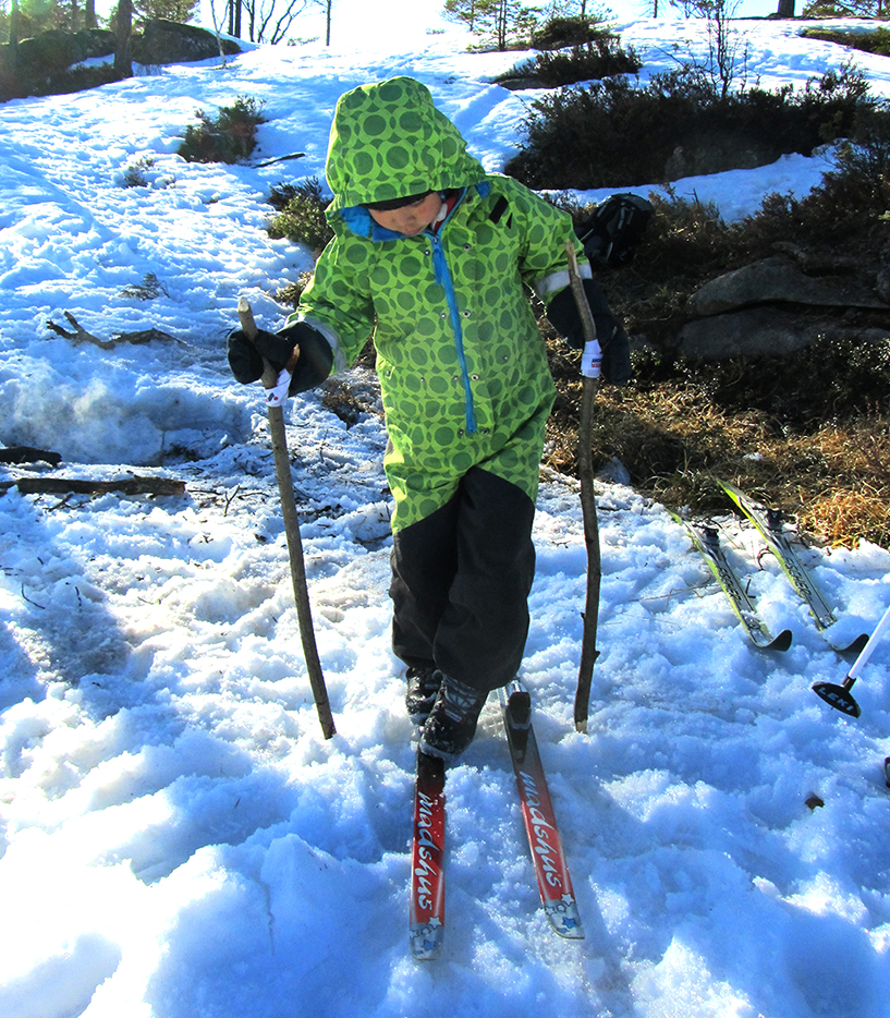 Imponerende bedrift av en 5 åring. Og som forventet av en 50 åring med tommetanker. Som vanlig denne vinteren fant pølser, Swix, gamle statoilkrus og ekstra skjerf veien ned i sekken. Kone og sønn + 2 barnebarn på til sammen 8 år ble med. Som desillusjonert avdanket orienteringsløper uten evne til avstandsbedømmelse og med manglende stedsans dro jeg de med opp til Tjåvann med Naspevarden i sikte. Parkering, avstapping av bilen og på med utstyret. Hei, hei. Men mine tomme tanker hadde klart å legge igjen stavene til 5 åringen hjemme. Jeg ble myrdet 4 ganger der og da. Allikevel jeg tok ansvar og spratt inn i skogen. Jeg spratt ut igjen med 2 pinner til 5 åringen som syntes det var kult.