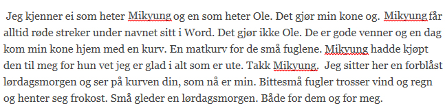Jeg kjenner ei som heter Mikyung og en som heter Ole. Det gjør min kone og. Mikyung får alltid røde streker under navnet sitt i Word.