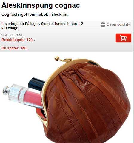 Uanstendig forslag eller spennende produkt. Som aktiv e-post mann hender det jeg får “spam”. E-poster jeg ikke vil ha. Tilbud om dett og hint og tilfeldige oppfordringer til å sende over noen penger til noen som så skal sende masse penger tilbake. Jeg åpner de aldri. Men nå kom det en fra bokklubben. Det er da jeg skulle ønske jeg ikke hadde fantasi. Søt skinnpung? Jeg kunne ikke la være. Selv om jeg allerede har en skinnpung lot jeg meg friste. Splitter pine! Den måtte jeg åpne. Og hva ser jeg. Søt, Cognac farget Åleskinnspung på tilbud. Tror jeg har fulgt dårlig med i fiskebiologitimen. Ålepung?
