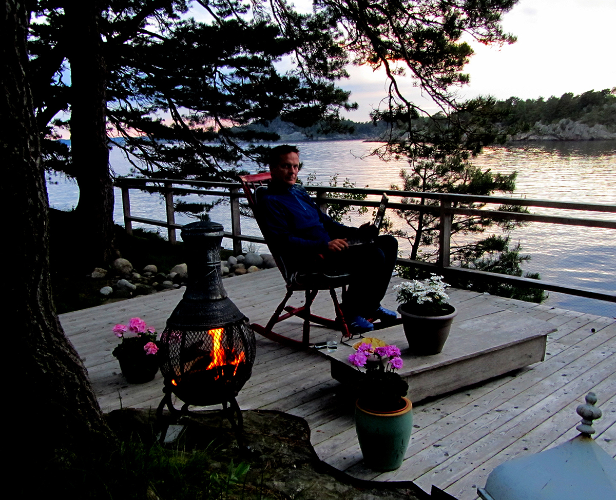 Klokken er 21.37. Jeg var ferdig på jobben for 5 timer og 37 minutter siden. For 4 timer og 37 minutter siden startet middagen som svigerdatter og svigerinne fra Thailand så deilig hadde tilberedt. Nye smaker igjen. Jeg er heldig. Nå som min kjære Maya er på tur er jeg alene. Men! Ikke helt alene. Jeg har mine måkevenner og svanen Tomine. En linerle, et fluesnapperpar og noen meiser. Og jeg har familien. Etter middag, sånn ca for 3 timer og 14 minutter siden badet min svigertatter i Sukkevann. Hun turte. Vi mygga. Og nå er klokka 21.42 og jeg skriver på bloggen. Dere ser på TV, er på Facebook, eller her. Jeg er ikke lenger her. Jeg fortsetter å sitte å se på sjøen. Sitter ute. Alene. Bare sammen med meg selv og kongen. Kongen er ei halvtam sildemåke av den fæle sorten. Jeg har det fint.
